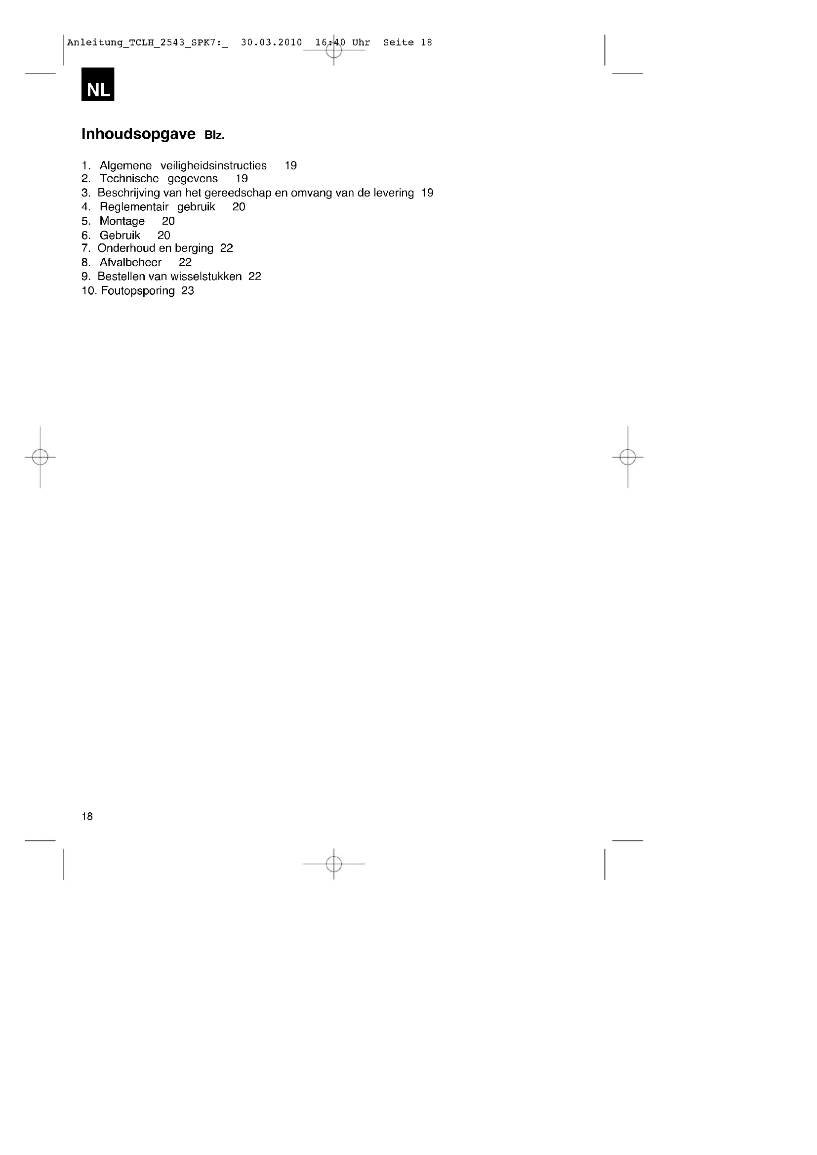 Gelieve bij het bestellen van wisselstukken vol- gende gegevens te vermelden: 앬 Type van het toestel 앬 Artikelnummer van het toestel 앬 Ident-nummer van het toestel 앬 Wisselstuknummer van het benodigd stuk Actuele prijzen en info vindt u terug onder www.isc-gmbh.info Anleitung_TCLH_2543_SPK7:_ 30.03.2010 16:40 Uhr Seite 2223