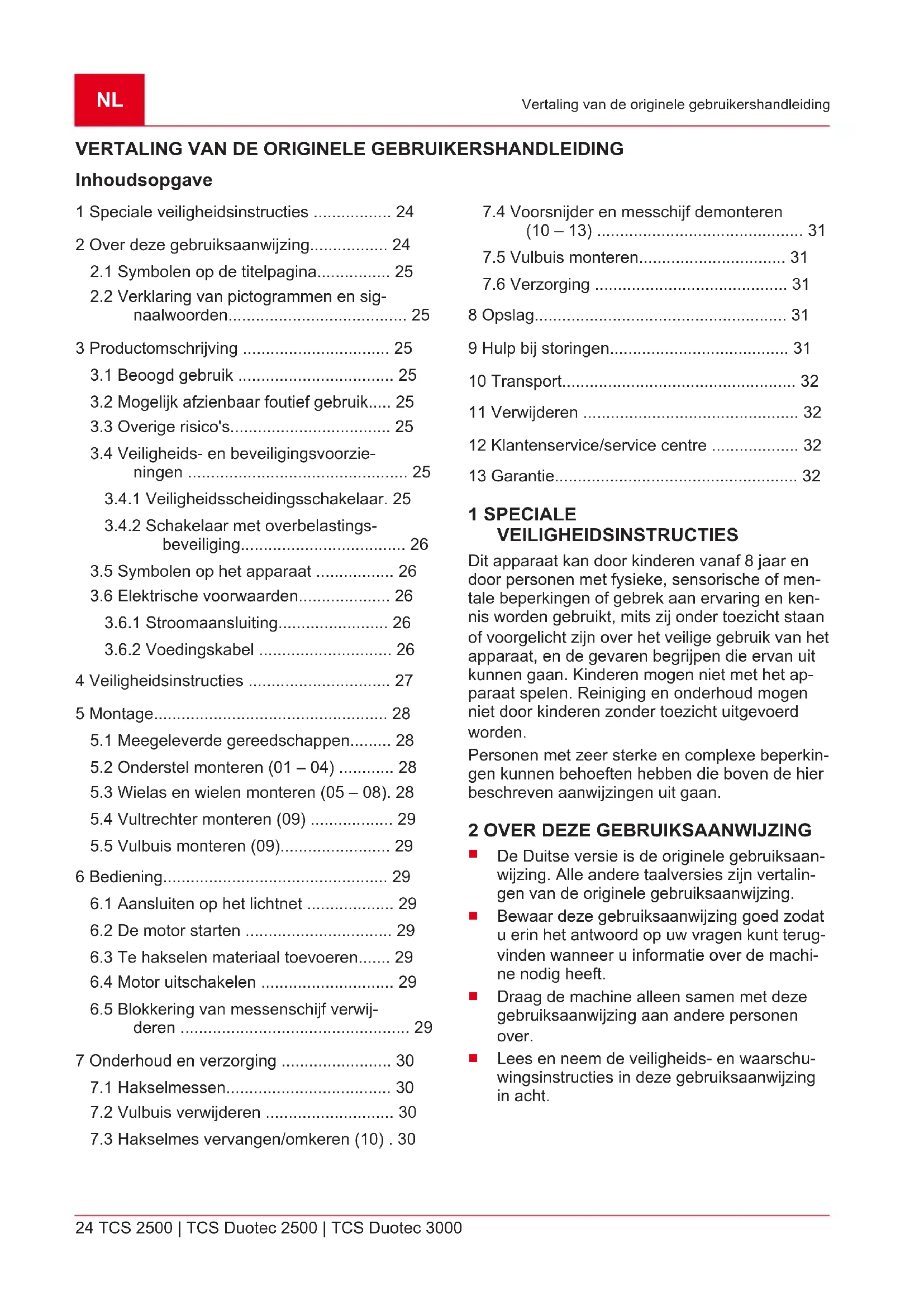 OPMERKING Neem contact op met onze klantenservice bij storingen die niet in deze tabel staan vermeld of die u niet zelf kunt oplossen. Storing Mogelijke oorzaak Oplossing Motor gaat niet draaien. Stopcontact in het huis is defect. Ander stopcontact in het huis gebrui- ken. Verlengkabel is beschadigd. Kabel controleren of eventueel ver- vangen. Hakselmateriaal wordt niet in machine ingetrok- ken. Opstuwing in de meseenheid. Indien nodig gehakseld product uit de meseenheid verwijderen. Meseenheid door nat hakselmate- riaal verstopt geraakt. Verstopping door toevoeren van tak- ken verhelpen. Hakselmateriaal wordt niet goed versnipperd. Messen bot of beschadigd Messen omkeren of vervangen. Motor schakelt uit. Motorbeveiligingsschakelaar heeft machine uitgeschakeld na overbe- lasting of blokkering van messen- schijf. Na ca. vijf minuten te zijn afgekoeld kan de motor weer worden inge- schakeld.NL 32 TCS 2500 | TCS Duotec 2500 | TCS Duotec 3000 Transport Storing Mogelijke oorzaak Oplossing Ongewone geluiden, klapperen aan het appa- raat. Bouten aan de motor, diens beves- tiging, het onderstel of hakselmes- sen losgeraakt. Bouten aandraaien. 10 TRANSPORT Voor eenvoudiger transport kan de hakselaar in het midden worden gescheiden (scharnieren).