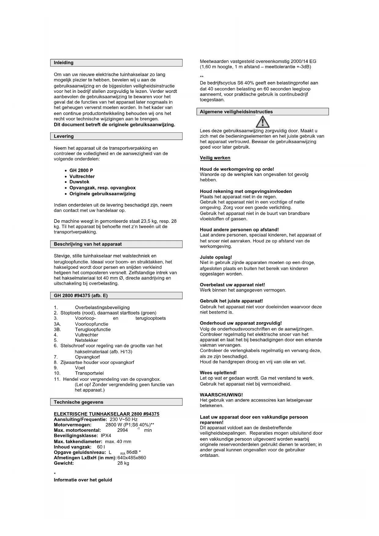 De bedrijfscyclus S6 40% geeft een belastingprofiel aan dat 40 seconden belasting en 60 seconden leegloop aanneemt, voor praktische gebruik is continubedrijf toegestaan. Algemene veiligheidsinstructies Lees deze gebruiksaanwijzing zorgvuldig door. Maakt u zich met de bedieningselementen en het juiste gebruik van het apparaat vertrouwd. Bewaar de gebruiksaanwijzing goed voor later gebruik. Veilig werken Houd de werkomgeving op orde! Wanorde op de werkplek kan ongevallen tot gevolg hebben. Houd rekening met omgevingsinvloeden Plaats het apparaat niet in de regen. Gebruik het apparaat niet in een vochtige of natte omgeving. Zorg voor een goede verlichting. Gebruik het apparaat niet in de buurt van brandbare vloeistoffen of gassen. Houd andere personen op afstand! Laat andere personen, speciaal kinderen, het apparaat of het snoer niet aanraken. Houd ze op afstand van de werkomgeving. Juiste opslag! Niet in gebruik zijnde apparaten moeten op een droge, afgesloten plaats en buiten het bereik van kinderen opgeslagen worden. Overbelast uw apparaat niet! Werk binnen het aangegeven vermogen. Gebruik het juiste apparaat! Gebruik het apparaat niet voor doeleinden waarvoor deze niet bestemd is. Onderhoud uw apparaat zorgvuldig! Volg de onderhoudsvoorschriften en de aanwijzingen. Controleer regelmatig het elektrische snoer van het apparaat en laat het bij beschadigingen door een erkende vakman vervangen. Controleer de verlengkabels regelmatig en vervang deze, als ze zijn beschadigd. Houd de handgrepen droog en vrij van olie en vet. Wees oplettend! Let op wat er gedaan wordt. Ga met verstand te werk. Gebruik het apparaat niet bij vermoeidheid. WAARSCHUWING! Het gebruik van andere accessoires kan letselgevaar betekenen. Laat uw apparaat door een vakkundige persoon repareren! Dit apparaat voldoet aan de desbetreffende veiligheidsbepalingen. Reparaties mogen uitsluitend door een vakkundige persoon uitgevoerd worden waarbij originele reserveonderdelen gebruikt dienen te worden; in ander geval kunnen ongevallen voor de gebruiker ontstaan.Veiligheidsinstructies specifiek voor dit apparaat Schakel voor het werken aan het snijmechanisme het apparaat uit en neem de netstekker uit het stopcontact. Indien de netkabel tijdens het gebruik doorgesneden of beschadigd wordt, raak deze dan in geen geval aan maar deactiveer de zekering van het betreffende elektrische circuit. Gebruik het apparaat nooit met een beschadigde kabel. Draag beschermende handschoenen, een veiligheidsbril, gehoorbescherming, vast schoeisel en een lange broek. Boven het apparaat uitstekend lang hakselmateriaal kan bij intrekken rondslaan, houd voldoende afstand en werk met aandacht.