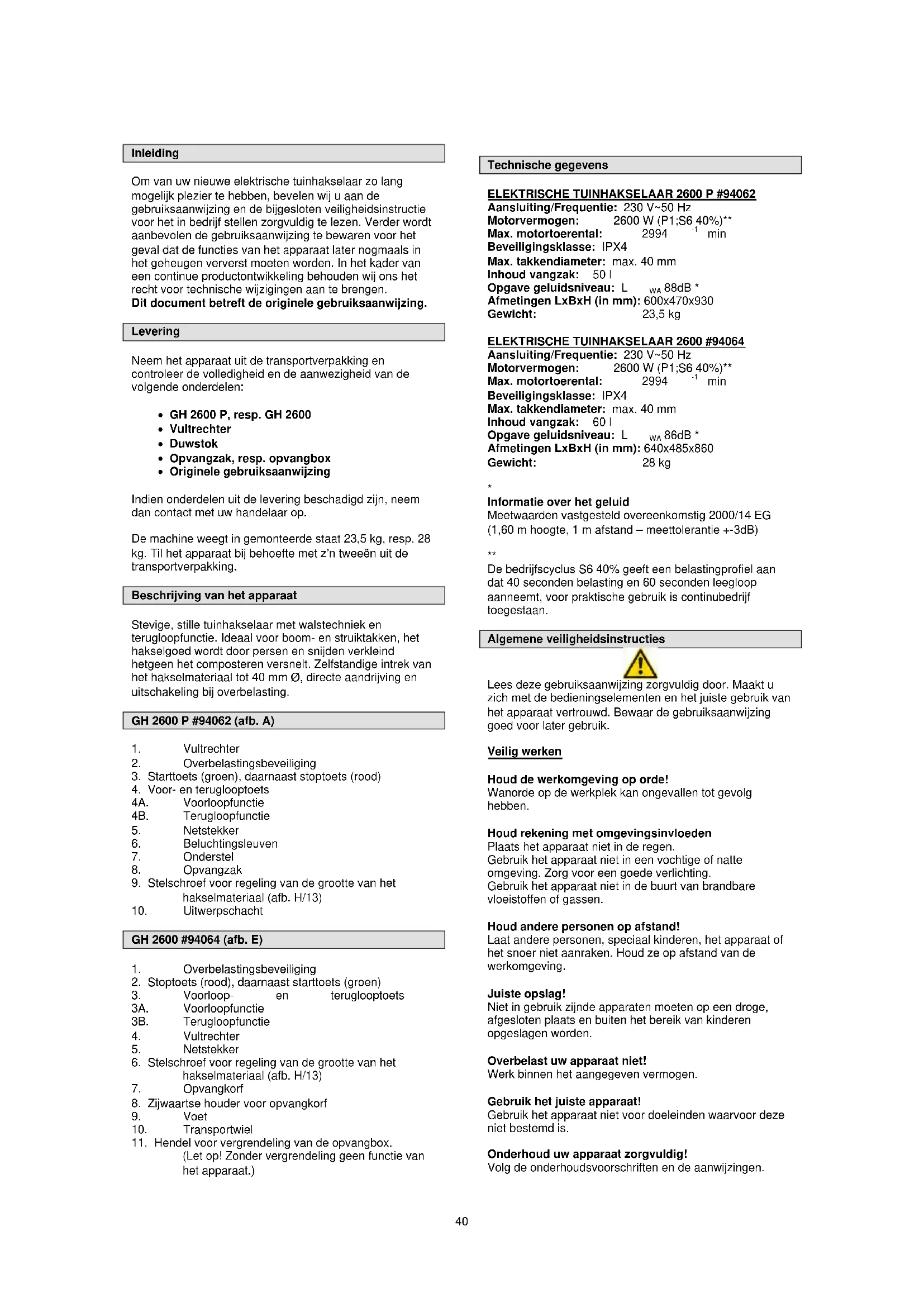 Beschrijving van het apparaat Stevige, stille tuinhakselaar met walstechniek en terugloopfunctie. Ideaal voor boom- en struiktakken, het hakselgoed wordt door persen en snijden verkleind hetgeen het composteren versnelt. Zelfstandige intrek van het hakselmateriaal tot 40 mm Ø, directe aandrijving en uitschakeling bij overbelasting.