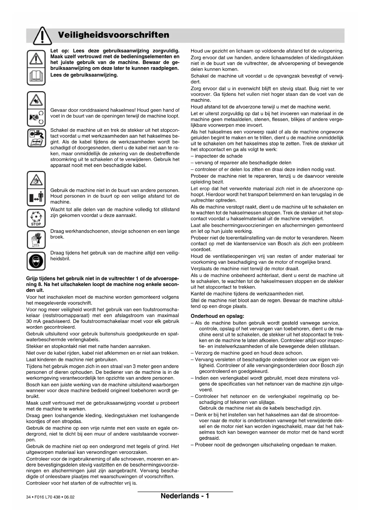 Con riserva di modifiche Centro di Assistenza Clienti Dichiarazione di conformità F016 L70 438 - book.book Seite 5 Dienstag, 28. Februar 2006 3:26 15 33 • F016 L70 438 • 06.02Nederlands - 1 Let op: Lees deze gebruiksaanwijzing zorgvuldig. Maak uzelf vertrouwd met de bedieningselementen en het juiste gebruik van de machine. Bewaar de ge- bruiksaanwijzing om deze later te kunnen raadplegen. Lees de gebruiksaanwijzing. Gevaar door ronddraaiend hakselmes! Houd geen hand of voet in de buurt van de openingen terwijl de machine loopt. Schakel de machine uit en trek de stekker uit het stopcon- tact voordat u met werkzaamheden aan het hakselmes be- gint. Als de kabel tijdens de werkzaamheden wordt be- schadigd of doorgesneden, dient u de kabel niet aan te ra- ken, maar onmiddellijk de zekering van de desbetreffende stroomkring uit te schakelen of te verwijderen. Gebruik het apparaat nooit met een beschadigde kabel. Gebruik de machine niet in de buurt van andere personen. Houd personen in de buurt op een veilige afstand tot de machine. Wacht tot alle delen van de machine volledig tot stilstand zijn gekomen voordat u deze aanraakt. Draag werkhandschoenen, stevige schoenen en een lange broek. Draag tijdens het gebruik van de machine altijd een veilig- heidsbril. Grijp tijdens het gebruik niet in de vultrechter 1 of de afvoerope- ning 8. Na het uitschakelen loopt de machine nog enkele secon- den uit. Voor het inschakelen moet de machine worden gemonteerd volgens het meegeleverde voorschrift. Voor nog meer veiligheid wordt het gebruik van een foutstroomscha- kelaar (reststroomapparaat) met een afslagstroom van maximaal 30 mA geadviseerd. De foutstroomschakelaar moet voor elk gebruik worden gecontroleerd. Gebruik uitsluitend voor gebruik buitenshuis goedgekeurde en spat- waterbeschermde verlengkabels. Stekker en stopkontakt niet met natte handen aanraken. Niet over de kabel rijden, kabel niet afklemmen en er niet aan trekken. Laat kinderen de machine niet gebruiken. Tijdens het gebruik mogen zich in een straal van 3 meter geen andere personen of dieren ophouden. De bediener van de machine is in de werkomgeving verantwoordelijk ten opzichte van andere personen. Bosch kan een juiste werking van de machine uitsluitend waarborgen wanneer voor deze machine bedoeld origineel toebehoren wordt ge- bruikt. Maak uzelf vertrouwd met de gebruiksaanwijzing voordat u probeert met de machine te werken. Draag geen loshangende kleding, kledingstukken met loshangende koordjes of een stropdas. Gebruik de machine op een vrije ruimte met een vaste en egale on- dergrond, niet te dicht bij een muur of andere vaststaande voorwer- pen. Gebruik de machine niet op een ondergrond met tegels of grind. Het uitgeworpen materiaal kan verwondingen veroorzaken. Controleer voor de ingebruikneming of alle schroeven, moeren en an- dere bevestigingsdelen stevig vastzitten en de beschermingsvoorzie- ningen en afschermingen juist zijn aangebracht. Vervang bescha- digde of onleesbare plaatjes met waarschuwingen of voorschriften. Controleer voor het starten of de vultrechter vrij is. Houd uw gezicht en lichaam op voldoende afstand tot de vulopening. Zorg ervoor dat uw handen, andere lichaamsdelen of kledingstukken niet in de buurt van de vultrechter, de afvoeropening of bewegende delen kunnen komen. Schakel de machine uit voordat u de opvangzak bevestigt of verwij- dert. Zorg ervoor dat u in evenwicht blijft en stevig staat. Buig niet te ver voorover. Ga tijdens het vullen niet hoger staan dan de voet van de machine. Houd afstand tot de afvoerzone terwijl u met de machine werkt. Let er uiterst zorgvuldig op dat u bij het invoeren van materiaal in de machine geen metaaldelen, stenen, flessen, blikjes of andere verge- lijkbare voorwerpen mee invoert. Als het hakselmes een voorwerp raakt of als de machine ongewone geluiden begint te maken en te trillen, dient u de machine onmiddellijk uit te schakelen om het hakselmes stop te zetten. Trek de stekker uit het stopcontact en ga als volgt te werk: – inspecteer de schade – vervang of repareer alle beschadigde delen – controleer of er delen los zitten en draai deze indien nodig vast. Probeer de machine niet te repareren, tenzij u de daarvoor vereiste opleiding bezit. Let erop dat het verwerkte materiaal zich niet in de afvoerzone op- hoopt. Hierdoor wordt het transport belemmerd en kan terugslag in de vultrechter optreden. Als de machine verstopt raakt, dient u de machine uit te schakelen en te wachten tot de hakselmessen stoppen. Trek de stekker uit het stop- contact voordat u hakselmateriaal uit de machine verwijdert. Laat alle beschermingsvoorzieningen en afschermingen gemonteerd en let op hun juiste werking. Probeer niet de toerentalinstelling van de motor te veranderen. Neem contact op met de klantenservice van Bosch als zich een probleem voordoet. Houd de ventilatieopeningen vrij van resten of ander materiaal ter voorkoming van beschadiging van de motor of mogelijke brand. Verplaats de machine niet terwijl de motor draait. Als u de machine onbeheerd achterlaat, dient u eerst de machine uit te schakelen, te wachten tot de hakselmessen stoppen en de stekker uit het stopcontact te trekken. Kantel de machine tijdens de werkzaamheden niet. Stel de machine niet bloot aan de regen. Bewaar de machine uitslui- tend op een droge plaats. Onderhoud en opslag: – Als de machine buiten gebruik wordt gesteld vanwege service, controle, opslag of het vervangen van toebehoren, dient u de ma- chine eerst uit te schakelen, de stekker uit het stopcontact te trek- ken en de machine te laten afkoelen. Controleer altijd voor inspec- tie- en instelwerkzaamheden of alle bewegende delen stilstaan. – Verzorg de machine goed en houd deze schoon. – Vervang versleten of beschadigde onderdelen voor uw eigen vei- ligheid. Controleer of alle vervangingsonderdelen door Bosch zijn gecontroleerd en goedgekeurd. – Indien een verlengkabel wordt gebruikt, moet deze minstens vol- gens de specificaties van het netsnoer 