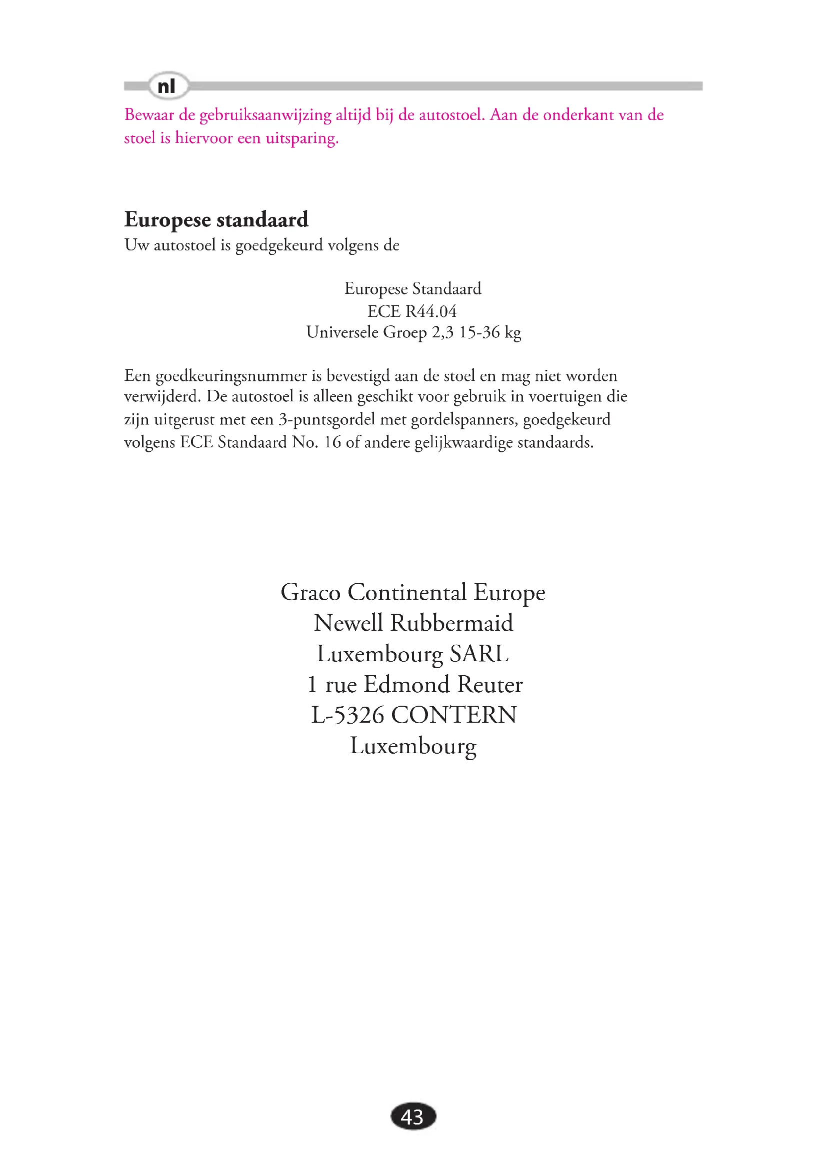Bewaar de gebruiksaanwijzing altijd bij de autostoel. Aan de onderkant van de stoel is hiervoor een uitsparing. Europese standaard Uw autostoel is goedgekeurd volgens de Europese Standaard ECE R44.04 Universele Groep 2,3 15-36 kg Een goedkeuringsnummer is bevestigd aan de stoel en mag niet worden verwijderd. De autostoel is alleen geschikt voor gebruik in voertuigen die zijn uitgerust met een 3-puntsgordel met gordelspanners, goedgekeurd volgens ECE Standaard No. 16 of andere gelijkwaardige standaards. Graco Continental Europe Newell Rubbermaid Luxembourg SARL 1 rue Edmond Reuter L-5326 CONTERN Luxembourg nl44 WAARSCHUWING GEBRUIK DEZE AUTOSTOEL NIET VOORDAT U DE AANWIJZINGEN GELEZEN EN BEGREPEN HEBT. HET IS BELANGRIJK DAT HET HEUPDEEL van de autogordel correct via de rode gordelgeleiders loopt onder de armleuningen van de stoelverhoger. De schoudergordel moet door de rode gordelgeleider lopen wanneer deze met een rug- leuning gebruikt wordt of door de rode schoudergordelclip wanneer deze zonder rugleuning gebruikt wordt. Controleer of de gordel niet gedraaid is. Zorg dat de gordels precies ZODANIG zitten als afgebeeld in deze instructies. ONJUIST GEBRUIK VAN DEZE AUTOSTOEL VERHOOGT DE KANS OP ERNSTIG LETSEL OF DE DOOD BIJ EEN SCHERPE BOCHT, PLOTSE LINGE STOP OF ONGELUK. Uw kind kan in een voertuig ook letsel oplopen zonder een ongeluk. Plotseling remmen en scherpe bochten kunnen uw kind verwonden als de autostoel onjuist gemonteerd is of als uw kind niet goed in de autostoel gezet is. PLAATS DE AUTOSTOEL ZODANIG IN DE AUTO DAT DEZE NIET BEKLEMD KAN RAKEN DOOR EEN BEWEEGBARE STOEL OF AUTO DEUR. GEBRUIK NOOIT een niet-originele bekleding op deze autostoel. Gebruik alleen originele Graco onderdelen. GEBRUIK de autostoel NOOIT op een andere manier dan voorgeschreven. Volgens ongelukstatistieken zitten kinderen VEILIGER op de achterbank dan op de voorstoel. Kijk, voor een voertuig met een passagiersairbag, in de gebruiksaan- wijzing van de auto en in de aanwijzingen voor monteren van deze autostoel. LAAT UW KIND NOOIT ZONDER TOEZICHT. LAAT DE AUTOSTOEL NOOIT LOS IN DE AUTO STAAN. Een losse autostoel kan inzittenden verwonden. Verwijder de autostoel of zet hem vast in de auto. nl45 WAARSCHUWING LAAT NOOIT BAGAGE of andere voorwerpen los in de auto, als deze iemand kunnen verwonden bij een ongeluk. VERVANG DE AUTOSTOEL ALTIJD NA EEN ONGELUK. Een ongeluk beschadigt de autostoel zonder dat het zichtbaar is. BRENG GEEN VERANDERINGEN OP DE AUTOSTOEL aan en gebruik alleen originele accessoires of onderdelen. GEBRUIK DE AUTOSTOEL nooit als deze beschadigd is of onderdelen mist. DE AUTOSTOEL KAN ERG WARM WORDEN IN DE ZON. Controleer altijd of de temperatuur van de kunststof en metalen delen niet te hoog is voor uw kind. Plaats dan pas uw kind in de stoel. GEEF UW AUTOSTOEL nooit aan een ander zonder de gebruiksaanwijzing ook te geven. GEBRUIK NOOIT EEN TWEEDEHANDS AUTOSTOEL of een autostoel waarvan u de geschiedenis niet kent. GEBRUIK DEZE AUTOSTOEL nooit als de armleuningen niet aan de zitver- hoger bevestigd zijn. Onderhoud