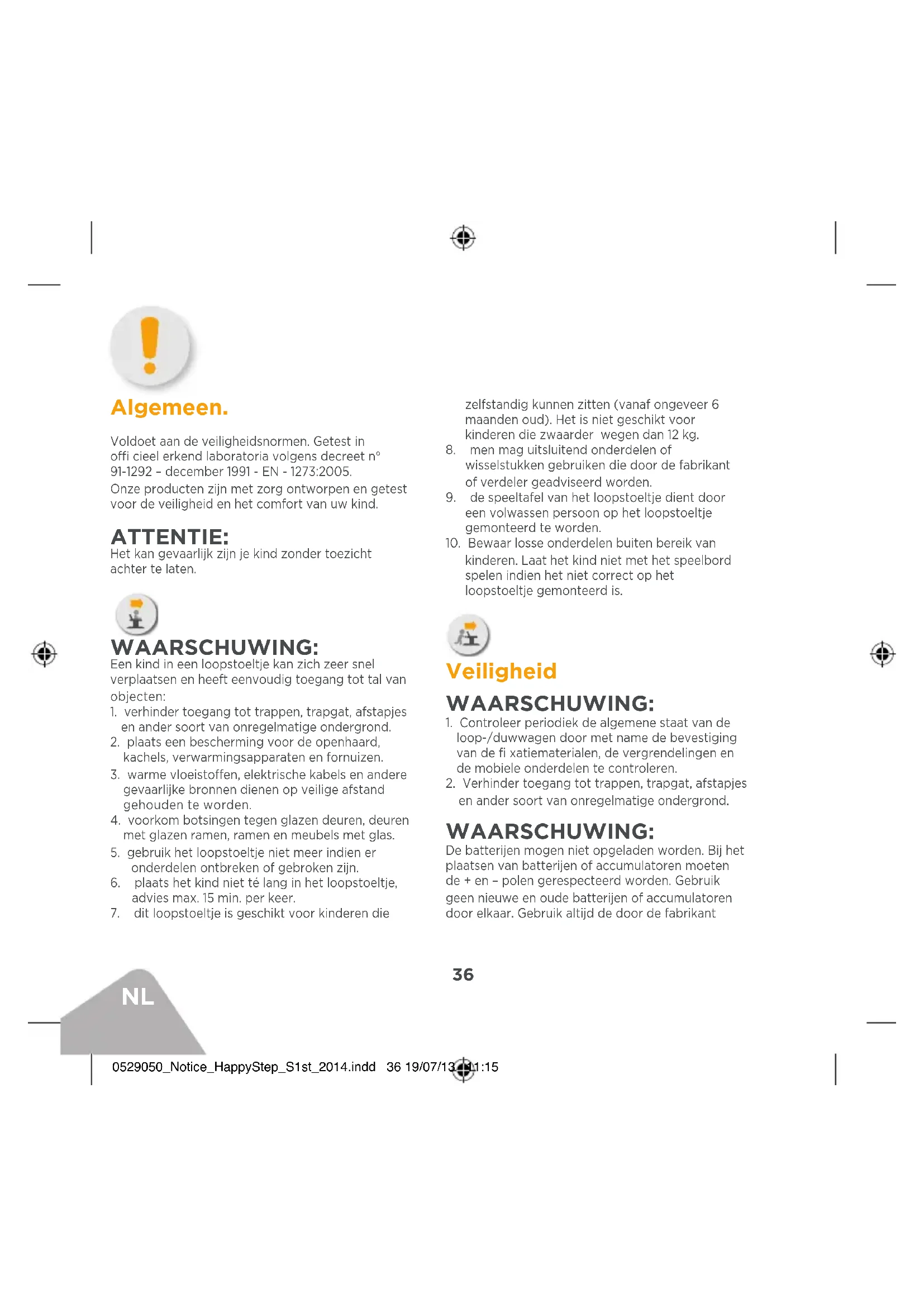 Algemeen. Voldoet aan de veiligheidsnormen. Getest in offi cieel erkend laboratoria volgens decreet n° 91-1292 – december 1991 - EN - 1273:2005. Onze producten zijn met zorg ontworpen en getest voor de veiligheid en het comfort van uw kind. ATTENTIE: Het kan gevaarlijk zijn je kind zonder toezicht achter te laten. WAARSCHUWING: Een kind in een loopstoeltje kan zich zeer snel verplaatsen en heeft eenvoudig toegang tot tal van objecten:
