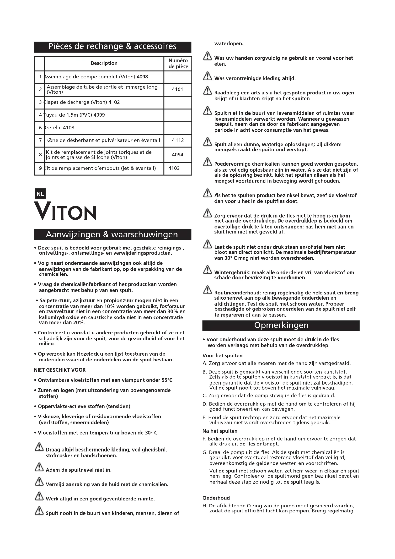 - Voor onderhoud van deze spuit moet de druk in de fles worden verlaagd met behulp van de overdrukklep. Voor het spuiten A. Zorg ervoor dat alle moeren met de hand zijn vastgedraaid. B. Deze spuit is gemaakt van verschillende soorten kunststof. Zelfs als de te spuiten vloeistof in kunststof verpakt is, is dat geen garantie dat de vloeistof de spuit niet zal beschadigen. Vul de spuit nooit tot boven het maximale vulniveau. C. Zorg ervoor dat de pomp stevig in de fles is gedraaid. D. Bedien de overdrukklep met de hand om te controleren of hij goed functioneert en kan bewegen. E. Houd de spuit rechtop en zorg ervoor dat het maximale vulniveau niet wordt overschreden tijdens gebruik. Na het spuiten F. Bedien de overdrukklep met de hand om ervoor te zorgen dat alle druk uit de fles ontsnapt. G. Draai de pomp uit de fles. Als de spuit met chemicaliën is gebruikt, voer eventueel resterend vloeistof dan veilig af, overeenkomstig de geldende wetten en voorschriften. Vul de spuit met schoon water, zet hem weer in elkaar en spuit hem leeg. Controleer of de spuitmond geen bezinksel bevat en herhaal deze stap zo nodig tot de spuit leeg is. Onderhoud H. De afdichtende O-ring van de pomp moet gesmeerd worden, zodat de spuit efficiënt lucht kan pompen. Breng regelmatig Pièces de rechange & accessoires