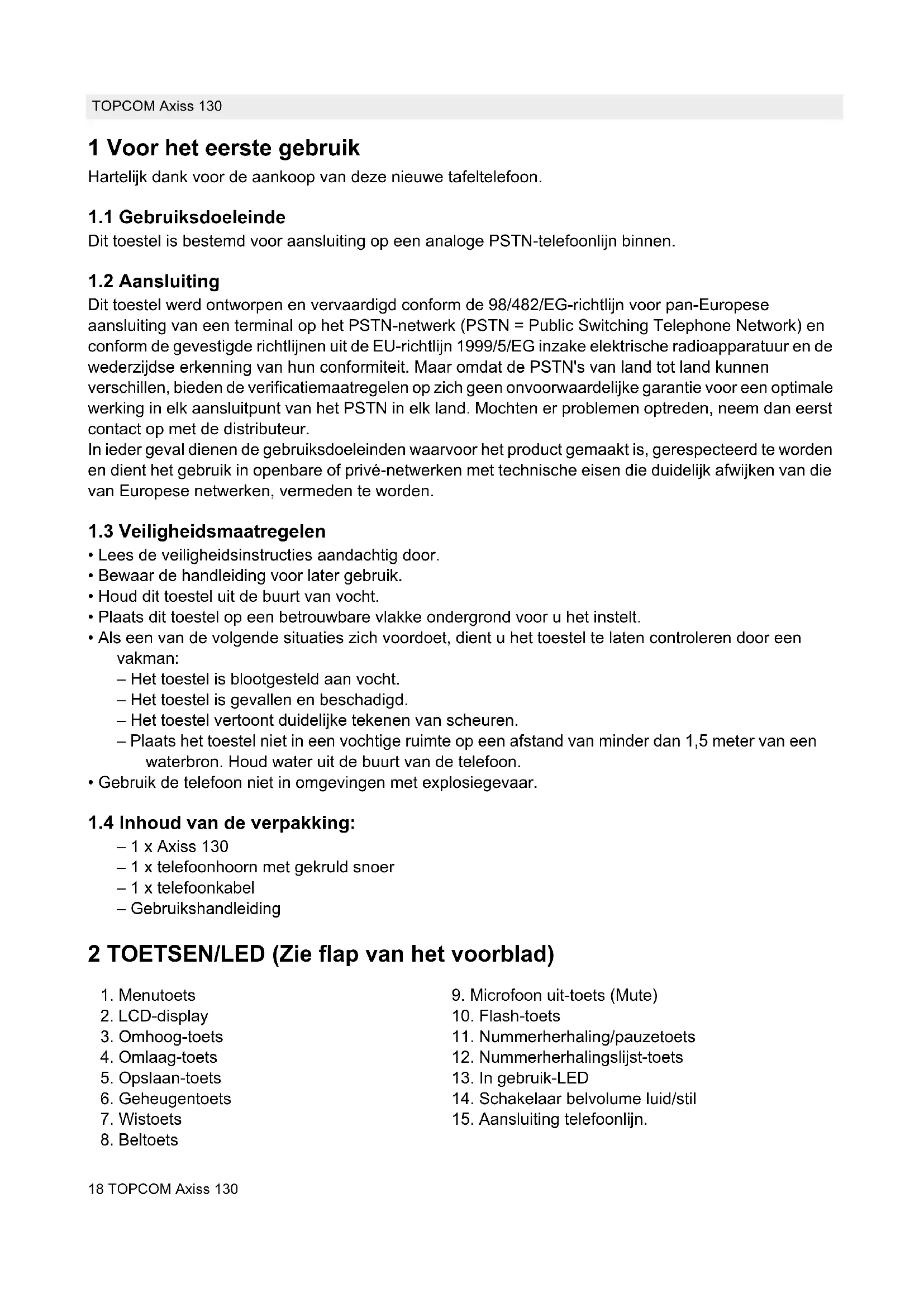 - Het opgeslagen nummer zal automatisch worden gebeld. 8 Technische gegevens Belopties: DTMF (toon) Batterijen: 3 x 1,5V niet-oplaadbare AAA batterijen Omgevingstemperatuur: +5 °C tot +45 °C Toegestane relatieve luchtvochtigheid: 25 tot 85 % 9 Reinigen Reinig de telefoon met een vochtige doek of met een antistatische doek. Gebruik nooit reinigingsmiddelen of schuurmiddelen. 10 Afvoeren van het toestel (milieu) Op het einde van de levenscyclus van het product mag u dit product niet met het normale huishoudelijke afval weggooien, maar moet u het naar een inzamelpunt brengen voor recyclage van elektrische en elektronische apparatuur. Dit wordt aangeduid door het symbool op het product, in de handleiding en/of op de verpakking. Sommige materialen van het product kunnen worden hergebruikt als u ze naar een inzamelpunt brengt. Door onderdelen of grondstoffen van gebruikte producten te hergebruiken, levert u een belangrijke bijdrage aan de bescherming van het milieu. Wend u tot uw plaatselijke overheid voor meer informatie over de inzamelpunten in uw buurt. Verwijder de batterijen voordat u het toestel naar een inzamelpunt brengt. Gooi de batterijen op een milieuvriendelijke manier weg volgens de regels die gelden in uw land.22 TOPCOM Axiss 130 TOPCOM Axiss 130 11 Topcom-garantie