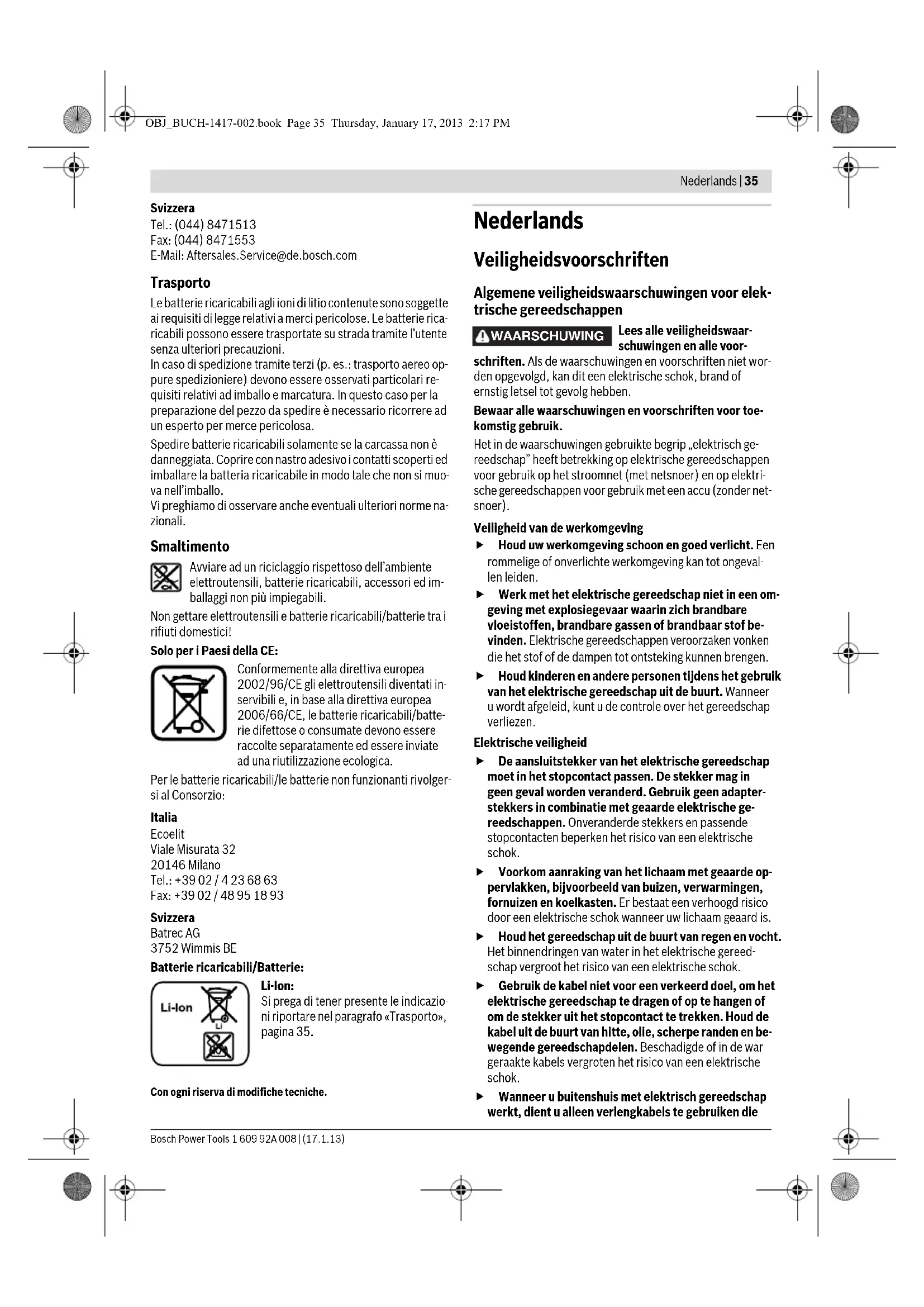 In questo modo è possibile condurre in modo preciso l’elettro- utensile lungo la linea di taglio marcata sul materiale. Protezione termosensibile contro sovraccarichi Utilizzando l’elettroutensile conformemente alle norme, lo stesso non può essere sovraccaricato. In caso di carico trop- po elevato oppure allontanamento dal campo di temperatura ammissibile di 0–70 °C la coppia viene ridotta oppure l’elet- troutensile si spegne. In caso di numero di giri ridotto, l’elet- troutensile funzionerà nuovamente con coppia massima sola- mente al raggiungimento della temperatura ammissibile della batteria ricaricabile. In caso di disinserimento automatico, spegnere l’elettroutensile, lasciare raffreddare la batteria e ri- accendere l’elettroutensile. Indicazioni per l’uso ottimale della batteria ricaricabile Proteggere la batteria ricaricabile da umidità ed acqua. Conservare la batteria ricaricabile esclusivamente nel campo di temperatura da 0 °C fino a 50 °C. Non lasciare la batteria ricaricabile p.es. in estate nell’automobile. Una sensibile riduzione della durata del funzionamento dopo l’operazione di ricarica sta ad indicare che la batteria ricarica- bile dovrà essere sostituita. Si prega di attenersi alle indicazioni relative allo smaltimento. Manutenzione ed assistenza Manutenzione e pulizia Prima di effettuare lavori all’elettroutensile (p. es. la- vori di manutenzione, cambio d’utensile, ecc.), nonché in caso di trasporto e di conservazione dello stesso, avere sempre cura di estrarne sempre la batteria rica- ricabile. In caso d’azionamento accidentale dell’interrut- tore di avvio/di arresto sussisterà il pericolo di incidenti. Per poter garantire buone e sicure operazioni di lavoro, tenere sempre puliti l’elettroutensile e le prese di ven- tilazione. Durante il taglio possono accumularsi resti di materiale sotto il lamierino di protezione. – Pulire regolarmente il lamierino di protezione 3 con un pennello oppure con un panno leggermente umido. Se nonostante gli accurati procedimenti di produzione e di controllo l’elettroutensile dovesse guastarsi, la riparazione va fatta effettuare da un punto di assistenza autorizzato per gli elettroutensili Bosch. In caso di richieste o di ordinazione di pezzi di ricambio, co- municare sempre il codice prodotto a 10 cifre riportato sulla targhetta di fabbricazione dell’elettroutensile! Assistenza clienti e consulenza impieghi Il servizio di assistenza risponde alle Vostre domande relative alla riparazione ed alla manutenzione del Vostro prodotto nonché concernenti le parti di ricambio. Disegni in vista esplosa ed informazioni relative alle parti di ricambio sono consultabili anche sul sito: www.bosch-pt.com Il team Bosch che si occupa della consulenza impieghi vi aiu- terà in caso di domande relative ai nostri prodotti ed ai loro accessori. Italia Officina Elettroutensili Robert Bosch S.p.A. Corso Europa, ang. Via Trieste 20 20020 LAINATE (MI) Tel.: (02) 3696 2663 Fax: (02) 3696 2662 Fax: (02) 3696 8677 E-Mail: officina.elettroutensili@it.bosch.com OBJ_BUCH-1417-002.book Page 34 Thursday, January 17, 2013 2:17 PMNederlands | 35 Bosch Power Tools 1 609 92A 008 | (17.1.13) Svizzera Tel.: (044) 8471513 Fax: (044) 8471553 E-Mail: Aftersales.Service@de.bosch.com Trasporto Le batterie ricaricabili agli ioni di litio contenute sono soggette ai requisiti di legge relativi a merci pericolose. Le batterie rica- ricabili possono essere trasportate su strada tramite l’utente senza ulteriori precauzioni. In caso di spedizione tramite terzi (p. es.: trasporto aereo op- pure spedizioniere) devono essere osservati particolari re- quisiti relativi ad imballo e marcatura. In questo caso per la preparazione del pezzo da spedire è necessario ricorrere ad un esperto per merce pericolosa. Spedire batterie ricaricabili solamente se la carcassa non è danneggiata. Coprire con nastro adesivo i contatti scoperti ed imballare la batteria ricaricabile in modo tale che non si muo- va nell’imballo. Vi preghiamo di osservare anche eventuali ulteriori norme na- zionali. Smaltimento Avviare ad un riciclaggio rispettoso dell’ambiente elettroutensili, batterie ricaricabili, accessori ed im- ballaggi non più impiegabili. Non gettare elettroutensili e batterie ricaricabili/batterie tra i rifiuti domestici! Solo per i Paesi della CE: Conformemente alla direttiva europea 2002/96/CE gli elettroutensili diventati in- servibili e, in base alla direttiva europea 2006/66/CE, le batterie ricaricabili/batte- rie difettose o consumate devono essere raccolte separatamente ed essere inviate ad una riutilizzazione ecologica. Per le batterie ricaricabili/le batterie non funzionanti rivolger- si al Consorzio: Italia Ecoelit Viale Misurata 32 20146 Milano Tel.: +39 02 / 4 23 68 63 Fax: +39 02 / 48 95 18 93 Svizzera Batrec AG 3752 Wimmis BE Batterie ricaricabili/Batterie: Li-Ion: Si prega di tener presente le indicazio- ni riportare nel paragrafo «Trasporto», pagina 35. Con ogni riserva di modifiche tecniche. Nederlands Veiligheidsvoorschriften Algemene veiligheidswaarschuwingen voor elek- trische gereedschappen Lees alle veiligheidswaar- schuwingen en alle voor- schriften. Als de waarschuwingen en voorschriften niet wor- den opgevolgd, kan dit een elektrische schok, brand of ernstig letsel tot gevolg hebben. Bewaar alle waarschuwingen en voorschriften voor toe- komstig gebruik. Het in de waarschuwingen gebruikte begrip „elektrisch ge- reedschap” heeft betrekking op elektrische gereedschappen voor gebruik op het stroomnet (met netsnoer) en op elektri- sche gereedschappen voor gebruik met een accu (zonder net- snoer). Veiligheid van de werkomgeving Houd uw werkomgeving schoon en goed verlicht. Een rommelige of onverlichte werkomgeving kan tot ongeval- len leiden. Werk met het elektrische gereedschap niet in een om- geving met explosiegevaar waarin zich brandbare vloeistoffen, brandbare gassen of brandbaar stof be- vinden. Elektrische gereedschappen