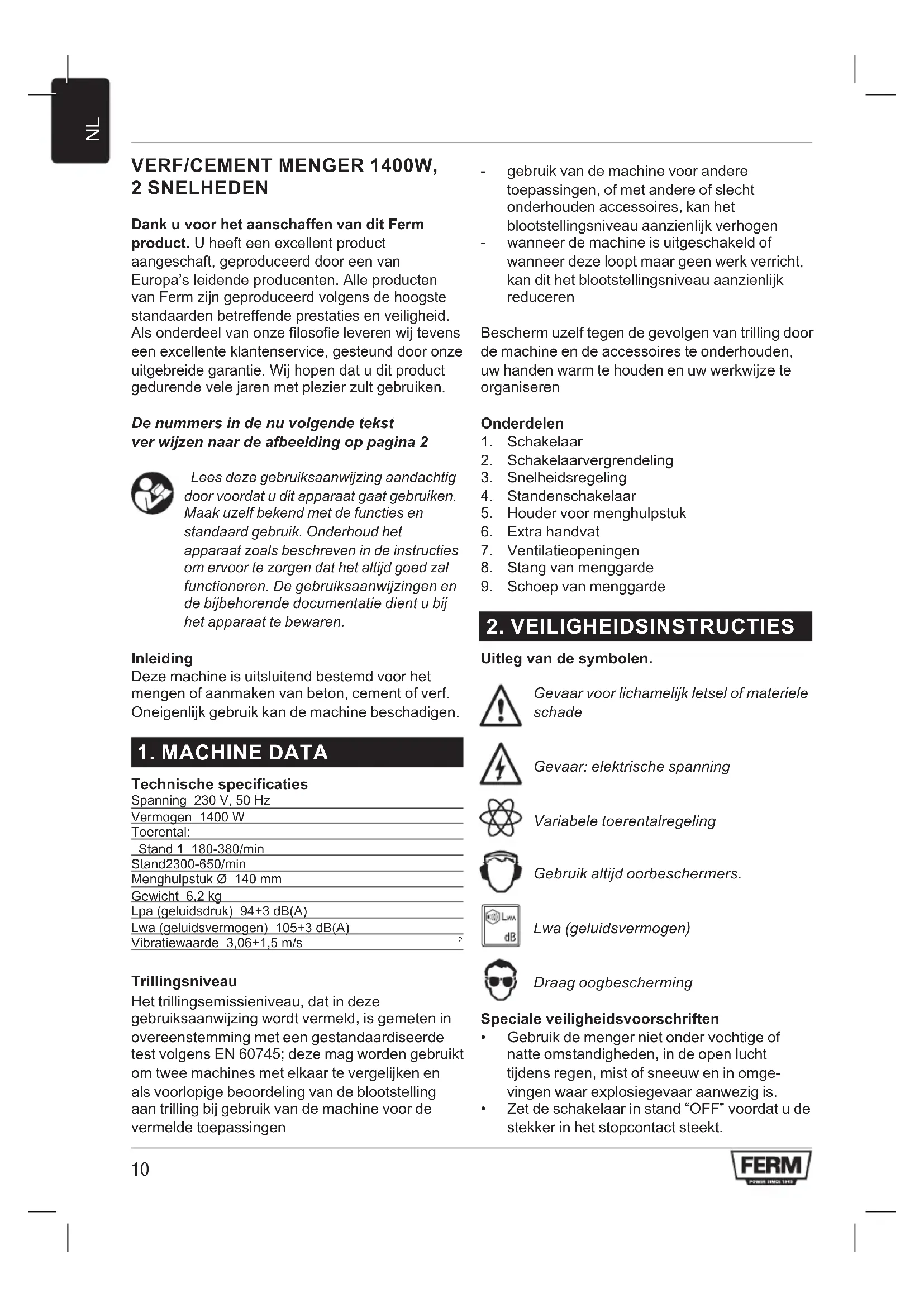 VERF/CEMENT MENGER 1400W, 2 SNELHEDEN Dank u voor het aanschaffen van dit Ferm product. U heeft een excellent product aangeschaft, geproduceerd door een van Europa’s leidende producenten. Alle producten van Ferm zijn geproduceerd volgens de hoogste standaarden betreffende prestaties en veiligheid. Als onderdeel van onze filosofie leveren wij tevens een excellente klantenservice, gesteund door onze uitgebreide garantie. Wij hopen dat u dit product gedurende vele jaren met plezier zult gebruiken. De nummers in de nu volgende tekst ver wijzen naar de afbeelding op pagina 2 Lees deze gebruiksaanwijzing aandachtig door voordat u dit apparaat gaat gebruiken. Maak uzelf bekend met de functies en standaard gebruik. Onderhoud het apparaat zoals beschreven in de instructies om ervoor te zorgen dat het altijd goed zal functioneren. De gebruiksaanwijzingen en de bijbehorende documentatie dient u bij het apparaat te bewaren. Inleiding Deze machine is uitsluitend bestemd voor het mengen of aanmaken van beton, cement of verf. Oneigenlijk gebruik kan de machine beschadigen.
