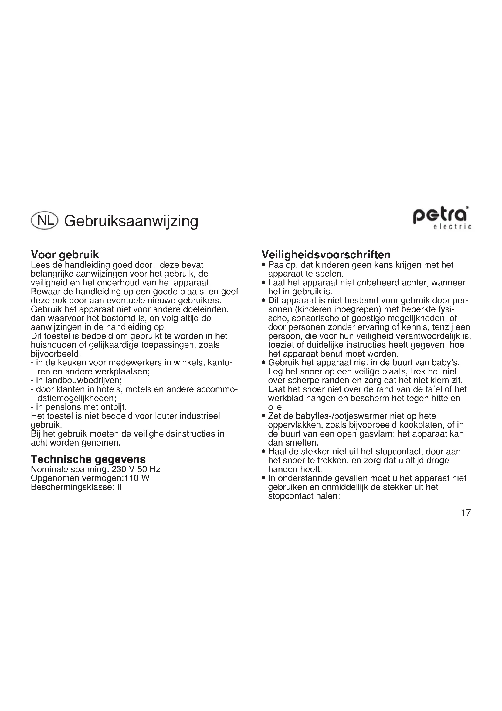 Wanneer het snoer van dit apparaat beschadigd raakt, moet het door een gekwalificeerde service- monteur vervangen worden. Door ondeskundige reparaties kunnen grote gevaren ontstaan voor de gebruiker. Ingebruikname Het apparaat kan gebruikt worden om babyflesjes en in de handel verkrijgbare potjes kant en klaar voe- ding tot 73 mm doorsnede gemakkelijk te verwar- men. Voor gebruik moet het snoer aan de bodem van het apparaat zoveel mogelijk opgewikkeld en de bijgesloten hevel mit het spitse einde naar beneden in de gleuf aan de bovenkant van het apparaat wor- den geschoven. Voor het verwarmen van potjes moet de hevel maar zover naar beneden worden geschoven, totdat de rand van het geopende potje noch maar net boven het apparaat uitsteekt. Voor babyflesjes de hevel helemaal naar beneden schuiven. Vervolgens het apparaat tot ca. 2 cm beneden de rand met water vullen. Opmerking: In sommige gevallen kunnen de potjes van sommige merken babyvoeding bij het inzetten in het apparaat een beetje klemmen. Meestal gebeurt dit, omdat het potje niet helemaal rond is. Wanneer19 U dit een beetje draait, zal het er weer gemakkelijk inpassen. Temperatuurinstelling Met de draaiknop kunt u de temperatuur van het waterbad instellen. De mate van verwarming van de babyvoeding is afhankelijk van de constantheid van de temperatuur en de aard van de fles of het potje. Voor vaster voedsel, evenals voor volle flesjes of potjes, moet u de draaiknop instellen op een hogere stand. In de praktijk komt u er snel achter welke stand het meest geschikt is. Wanneer het apparaat verwarmd wordt, brandt het controlelampje. Het lampje gaat weer uit, zodra de ingestelde temperatuur bereikt is. Om het glaasje te ontnemen, de hevel een beetje naar boven trekken. Schud flesjes, en roer de inhoud van potjes goed door elkaar, zodat de inhoud gelijkmatig warm is. Controleer de temperatuur altijd, door de fles of het potje tegen uw wang te houden, of, nog beter, door zelf even te proeven. Wanneer het voedsel voor enige tijd warm gehouden moet worden, laat de fles of het potje dan in het apparaat staan. De thermostaat zorgt voor een constante temperatuur, omdat het verwarmingselement van tijd tot tijd wordt ingeschakeld. Reiniging en onderhoud Voordat u het apparaat gaat schoonmaken, moet u de stekker uit het stopcontact halen en het water uit het apparaat gieten. Dompel het apparaat niet onder in water. Gebruik geen schuurmiddel, maar veeg het apparaat enkel schoon met een vochtige doek, eventueel met wat afwasmiddel. Het apparaat voldoet aan de Europese richt- lijnen 2006/95/EG, 2004/108/EG en 2005/32/EG. Dit product mag na afloop van zijn levensduur niet met het normale huishoudafval verwijderd worden, maar moet bij een verzamelplaats voor elektrische en elektronische apparaten worden afgegeven. Details zijn bij uw gemeentebe- stuur te verkrijgen. Technische wijzigingen voorbehouden. Gooi het verpakkingsmateriaal op verantwoorde wijze weg. CEpetra-electric Kundendienst Greisbacherstraße 6 D-89331 Burgau www.petra-electric.de Änderungen vorbehalten! - 091215 - 3697 0027