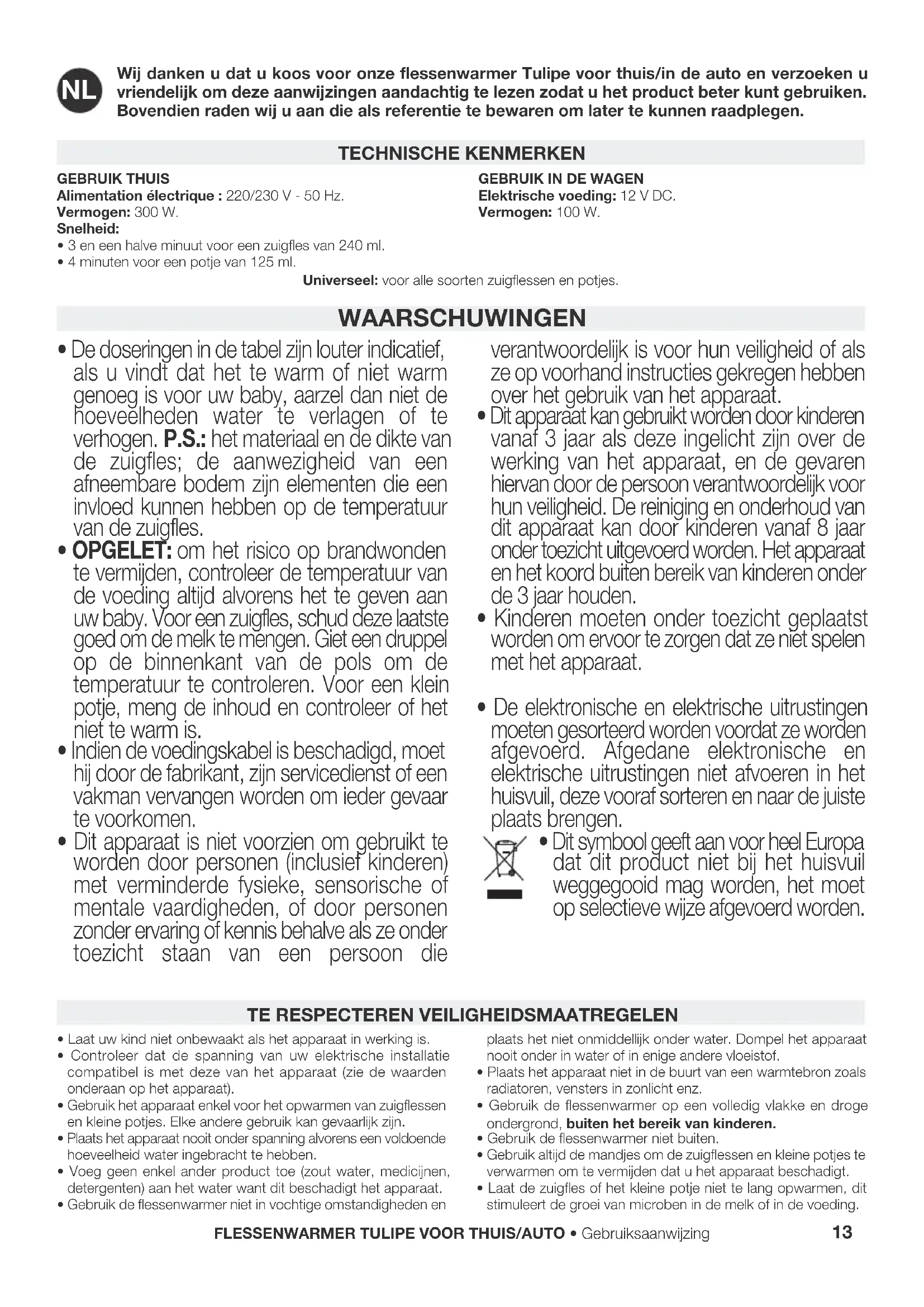 Wij danken u dat u koos voor onze flessenwarmer Tulipe voor thuis/in de auto en verzoeken u vriendelijk om deze aanwijzingen aandachtig te lezen zodat u het product beter kunt gebruiken. Bovendien raden wij u aan die als referentie te bewaren om later te kunnen raadplegen. WAARSCHUWINGEN
