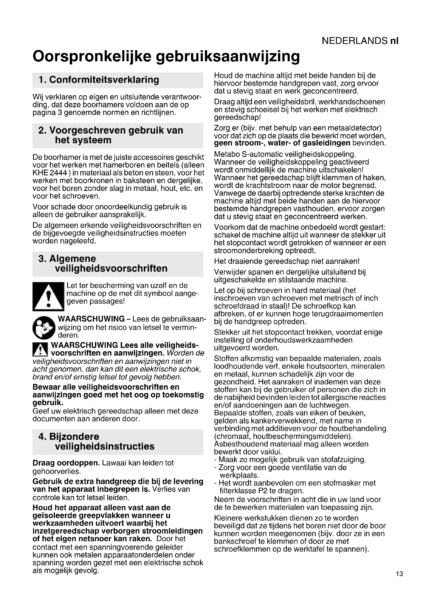 Oorspronkelijke gebruiksaanwijzing Wij verklaren op eigen en uitsluitende verantwoor- ding, dat deze boorhamers voldoen aan de op pagina 3 genoemde normen en richtlijnen. De boorhamer is met de juiste accessoires geschikt voor het werken met hamerboren en beitels (alleen KHE 2444 ) in materiaal als beton en steen, voor het werken met boorkronen in baksteen en dergelijke, voor het boren zonder slag in metaal, hout, etc. en voor het schroeven. Voor schade door onoordeelkundig gebruik is alleen de gebruiker aansprakelijk. De algemeen erkende veiligheidsvoorschriften en de bijgevoegde veiligheidsinstructies moeten worden nageleefd. Let ter bescherming van uzelf en de machine op de met dit symbool aange- geven passages! WAARSCHUWING – Lees de gebruiksaan- wijzing om het risico van letsel te vermin- deren. WAARSCHUWING Lees alle veiligheids- voorschriften en aanwijzingen. Worden de veiligheidsvoorschriften en aanwijzingen niet in acht genomen, dan kan dit een elektrische schok, brand en/of ernstig letsel tot gevolg hebben. Bewaar alle veiligheidsvoorschriften en aanwijzingen goed met het oog op toekomstig gebruik. Geef uw elektrisch gereedschap alleen met deze documenten aan anderen door. Draag oordoppen. Lawaai kan leiden tot gehoorverlies. Gebruik de extra handgreep die bij de levering van het apparaat inbegrepen is. Verlies van controle kan tot letsel leiden. Houd het apparaat alleen vast aan de geïsoleerde greepvlakken wanneer u werkzaamheden uitvoert waarbij het inzetgereedschap verborgen stroomleidingen of het eigen netsnoer kan raken. Door het contact met een spanningvoerende geleider kunnen ook metalen apparaatonderdelen onder spanning worden gezet met een elektrische schok als mogelijk gevolg. Houd de machine altijd met beide handen bij de hiervoor bestemde handgrepen vast, zorg ervoor dat u stevig staat en werk geconcentreerd. Draag altijd een veiligheidsbril, werkhandschoenen en stevig schoeisel bij het werken met elektrisch gereedschap! Zorg er (bijv. met behulp van een metaaldetector) voor dat zich op de plaats die bewerkt moet worden, geen stroom-, water- of gasleidingen bevinden. Metabo S-automatic veiligheidskoppeling. Wanneer de veiligheidskoppeling geactiveerd wordt onmiddellijk de machine uitschakelen! Wanneer het gereedschap blijft klemmen of haken, wordt de krachtstroom naar de motor begrensd. Vanwege de daarbij optredende sterke krachten de machine altijd met beide handen aan de hiervoor bestemde handgrepen vasthouden, ervoor zorgen dat u stevig staat en geconcentreerd werken. Voorkom dat de machine onbedoeld wordt gestart: schakel de machine altijd uit wanneer de stekker uit het stopcontact wordt getrokken of wanneer er een stroomonderbreking optreedt. Het draaiende gereedschap niet aanraken! Verwijder spanen en dergelijke uitsluitend bij uitgeschakelde en stilstaande machine. Let op bij schroeven in hard materiaal (het inschroeven van schroeven met metrisch of inch schroefdraad in staal)! De schroefkop kan afbreken, of er kunnen hoge terugdraaimomenten bij de handgreep optreden. Stekker uit het stopcontact trekken, voordat enige instelling of onderhoudswerkzaamheden uitgevoerd worden. Stoffen afkomstig van bepaalde materialen, zoals loodhoudende verf, enkele houtsoorten, mineralen en metaal, kunnen schadelijk zijn voor de gezondheid. Het aanraken of inademen van deze stoffen kan bij de gebruiker of personen die zich in de nabijheid bevinden leiden tot allergische reacties en/of aandoeningen aan de luchtwegen. Bepaalde stoffen, zoals van eiken of beuken, gelden als kankerverwekkend, met name in verbinding met additieven voor de houtbehandeling (chromaat, houtbeschermingsmiddelen). Asbesthoudend materiaal mag alleen worden bewerkt door vaklui. - Maak zo mogelijk gebruik van stofafzuiging. - Zorg voor een goede ventilatie van de werkplaats. - Het wordt aanbevolen om een stofmasker met filterklasse P2 te dragen. Neem de voorschriften in acht die in uw land voor de te bewerken materialen van toepassing zijn. Kleinere werkstukken dienen zo te worden beveiligd dat ze tijdens het boren niet door de boor kunnen worden meegenomen (bijv. door ze in een bankschroef te klemmen of door ze met schroefklemmen op de werktafel te spannen).
