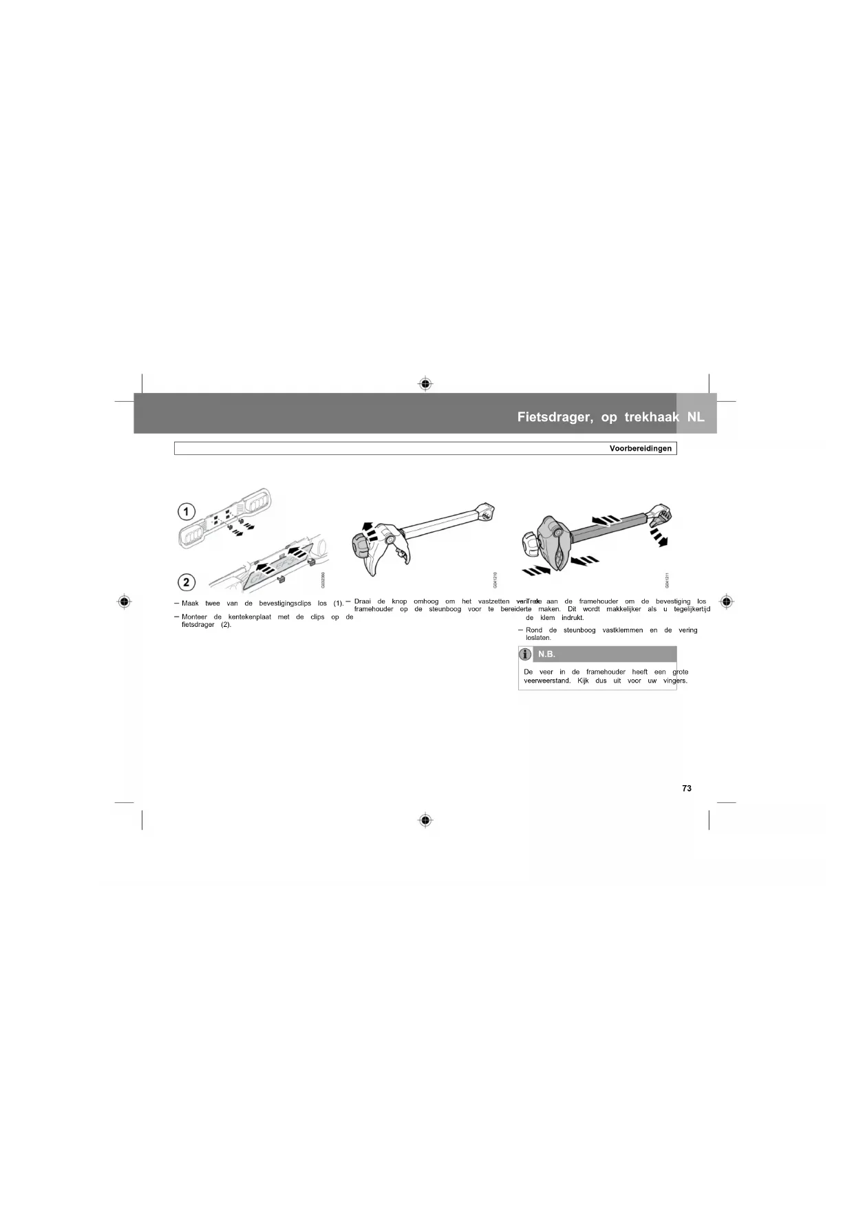 Rond de steunboog vastklemmen en de vering loslaten. N.B. De veer in de framehouder heeft een grote veerweerstand. Kijk dus uit voor uw vingers. Fietsdrager, op trekhaak NL Voorbereidingen