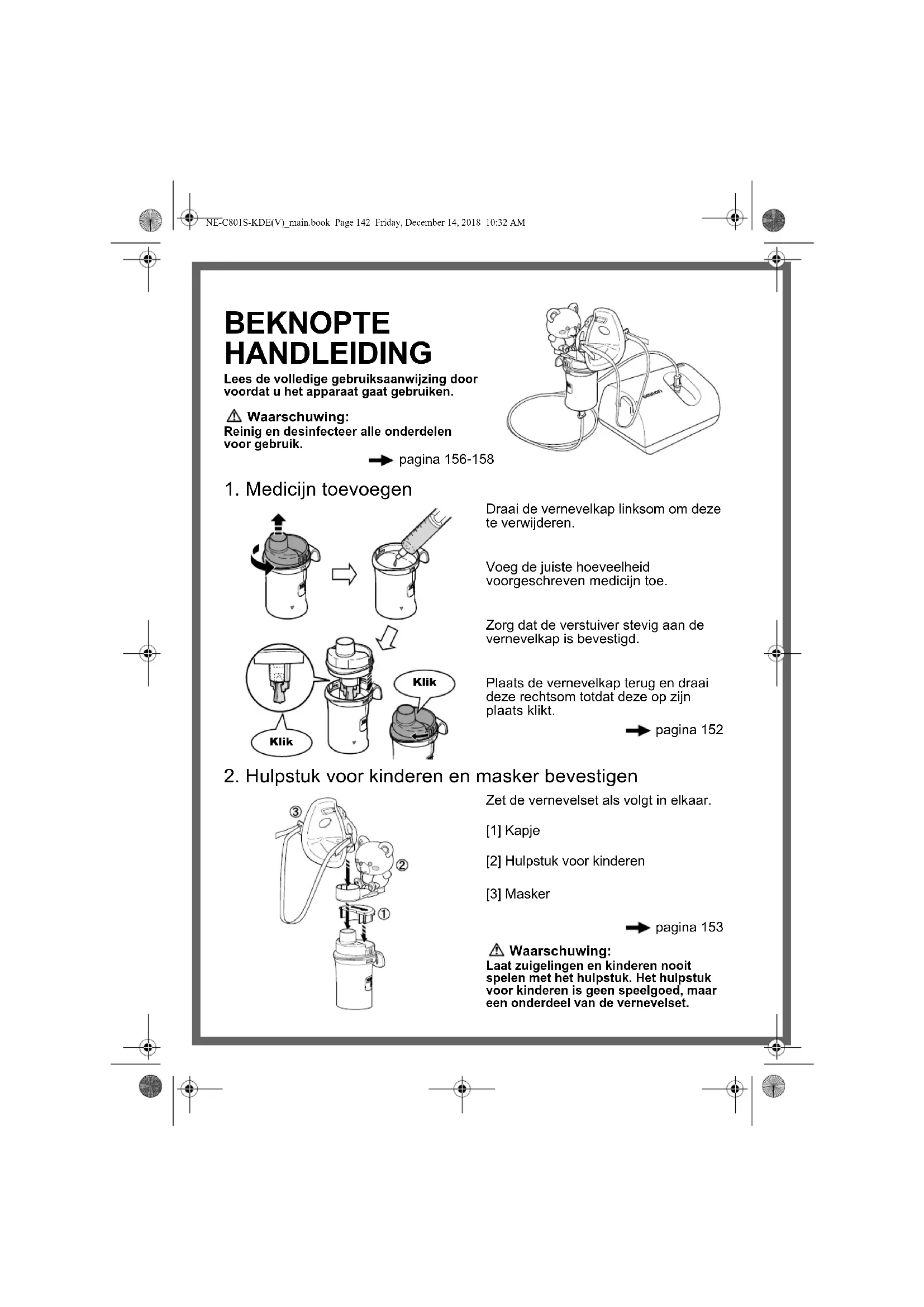 NE-C801S-KDE(V)_main.book Page 141 Friday, December 14, 2018 10:32 AMBEKNOPTE HANDLEIDING Lees de volledige gebruiksaanwijzing door voordat u het apparaat gaat gebruiken. Waarschuwing: Reinig en desinfecteer alle onderdelen voor gebruik. pagina 156-158