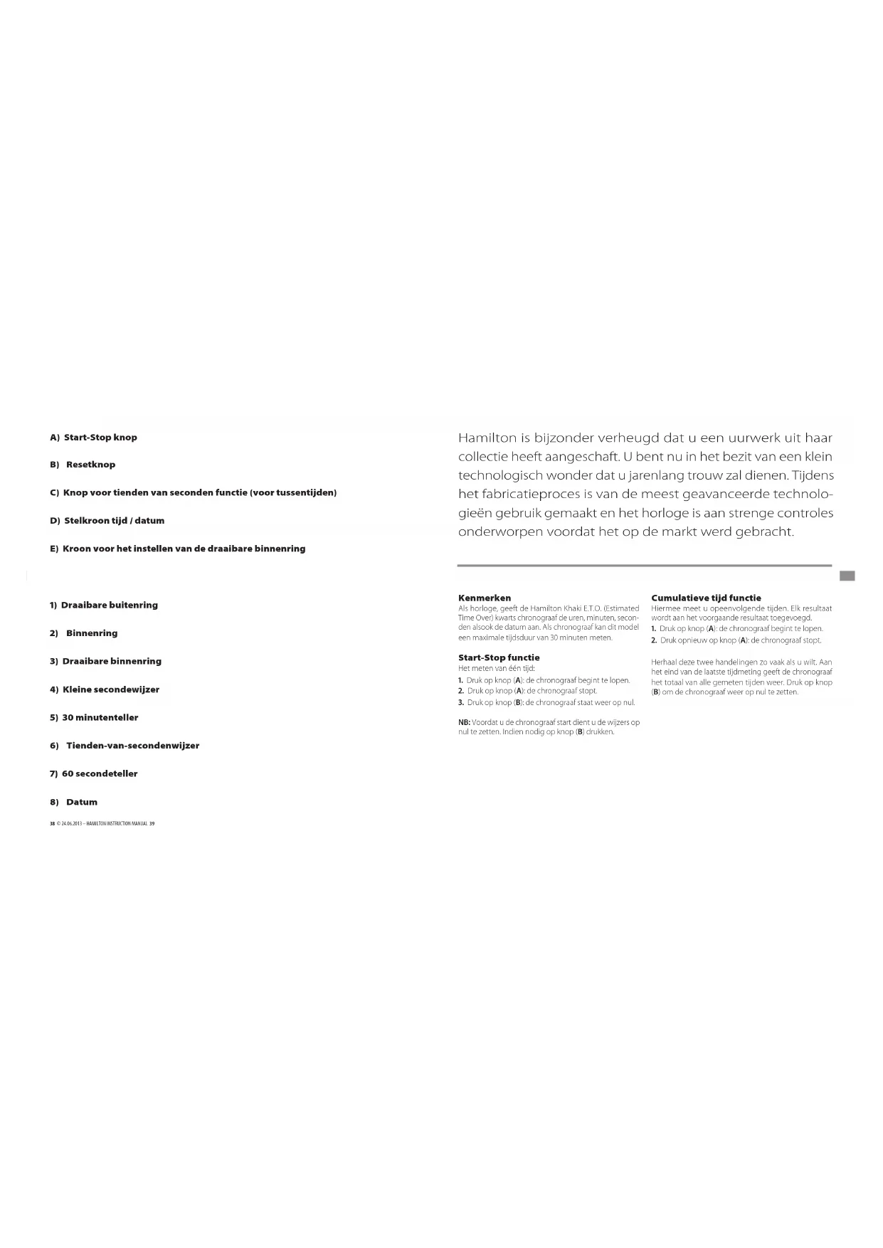 tenring (1) tegenover de rode pijl = 17,5 mpu. Aanpassing van tijdzone en datum Met de kroon (D) uitgetrokken tot de middenstand (1), kunt u de uurwijzer vooruit en achteruit verzetten zonder de minuten- en secondewijzers te wijzigen. De datum wordt aangepast elke keer dat de uurwijzer middernacht passeert. NB: De kronen (D) en (E) worden vast geschroefd voor een optimale waterbestendigheid. Voor toegang tot hun respectievelijke functies dient u ze los te schroeven. Zorg ervoor dat ze na elk gebruik opnieuw worden vast geschroefd. Instellen van de tijd Wanneer de kroon (D) in stand (2) staat, stoppen alle wij- zers van het horloge - inclusief de secondewijzer – en kunnen de uren- en minutenwijzers naar wens worden aangepast. Aanpassing van de chronograaf (Als de wijzers niet precies op nul staan.) Wanneer een chronograafwijzer draait, druk dan op de knop (A) om de chronograaf te stoppen, druk vervolgens op knop (B): de wijzers komen weer terug op de begin- positie. Indien de wijzers niet precies op nul terugkomen kan elke wijzer als volgt op de nulstand worden gezet: 30 minutenteller Met kroon (D) in stand 1: druk op knop (A) 60 secondeteller (witte wijzer – tienden-van-secondewijzer) Met kroon (D) in stand 2: druk op knop (A) 60 secondeteller (rode wijzer – secondewijzer) Met kroon (D) in stand 2: druk op knop (B) Opmerking: U kunt de wijzers sneller vooruit verzet- ten door de knop langer dan een seconde ingedrukt te houden. Belangrijk: Laat de kroon niet langer dan 20 min. in stand 1 omdat dit tot interferentie met de tijdfunctie kan leiden.44 © 24.06.2013 – HAMILTON INSTRUCTION MANUAL 45 Hamilton gläder sig över att du har valt en kronometer från deras kollektion. Du har köpt ett litet tekniskt underverk som kommer att tjäna dig troget i många år. Ytterst avancerad tek- nologi har använts genomgående i dess tillverkning och den har genomgått stränga kontroller innan den släpptes i handeln. Egenskaper Som klocka har kvartskronografen Hamilton Khaki E.T.O. (Estimated Time Over) tim-, minut-, sekund- och datum- visning. Som kronograf kan modellen mäta tider på upp till 30 minuter. ”Start-Stop”-funktionen Enkel tidtagning: