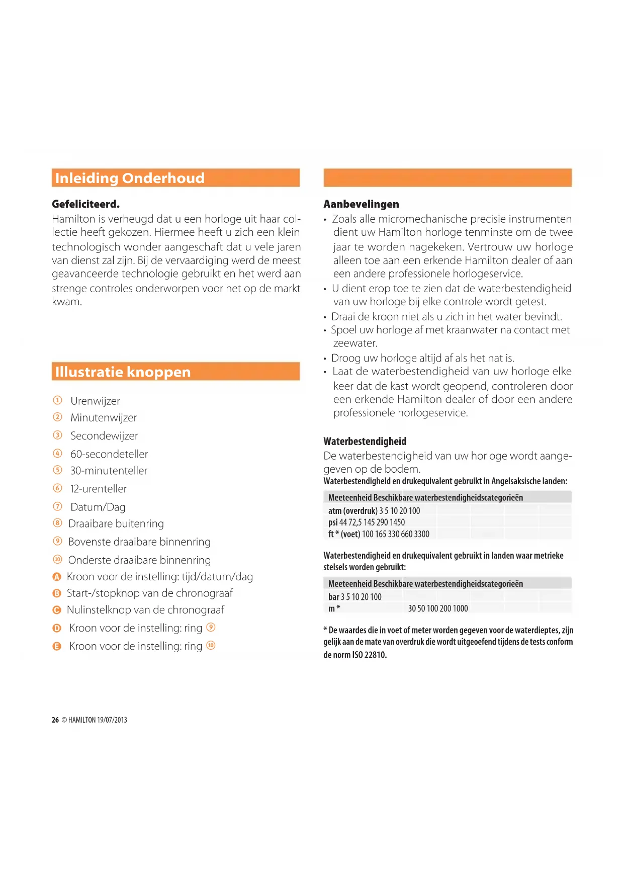 Se o vento está a soprar da direita, adicione o ângulo de derivação ao azimute magnético. Se o vento está a soprar da esquerda, subtraia o ângulo de derivação ao azimute magnético. Ex.: Azimute corrigido: 40° + 6,5° = 46,5° Para memorizar o valor, utilize a coroa E para indicar o azimute corrigido (46,5°) na luneta giratória interior 0, na parte inferior. Instruções de funcionamento26 © HAMILTON 19/07/2013 Inleiding Onderhoud Gefeliciteerd. Hamilton is verheugd dat u een horloge uit haar col- lectie heeft gekozen. Hiermee heeft u zich een klein technologisch wonder aangeschaft dat u vele jaren van dienst zal zijn. Bij de vervaardiging werd de meest geavanceerde technologie gebruikt en het werd aan strenge controles onderworpen voor het op de markt kwam. Illustratie knoppen 1 Urenwijzer 2 Minutenwijzer 3 Secondewijzer 4 60-secondeteller 5 30-minutenteller 6 12-urenteller 7 Datum/Dag 8 Draaibare buitenring 9 Bovenste draaibare binnenring 0 Onderste draaibare binnenring A Kroon voor de instelling: tijd/datum/dag B Start-/stopknop van de chronograaf C Nulinstelknop van de chronograaf D Kroon voor de instelling: ring 9 E Kroon voor de instelling: ring 0 Aanbevelingen
