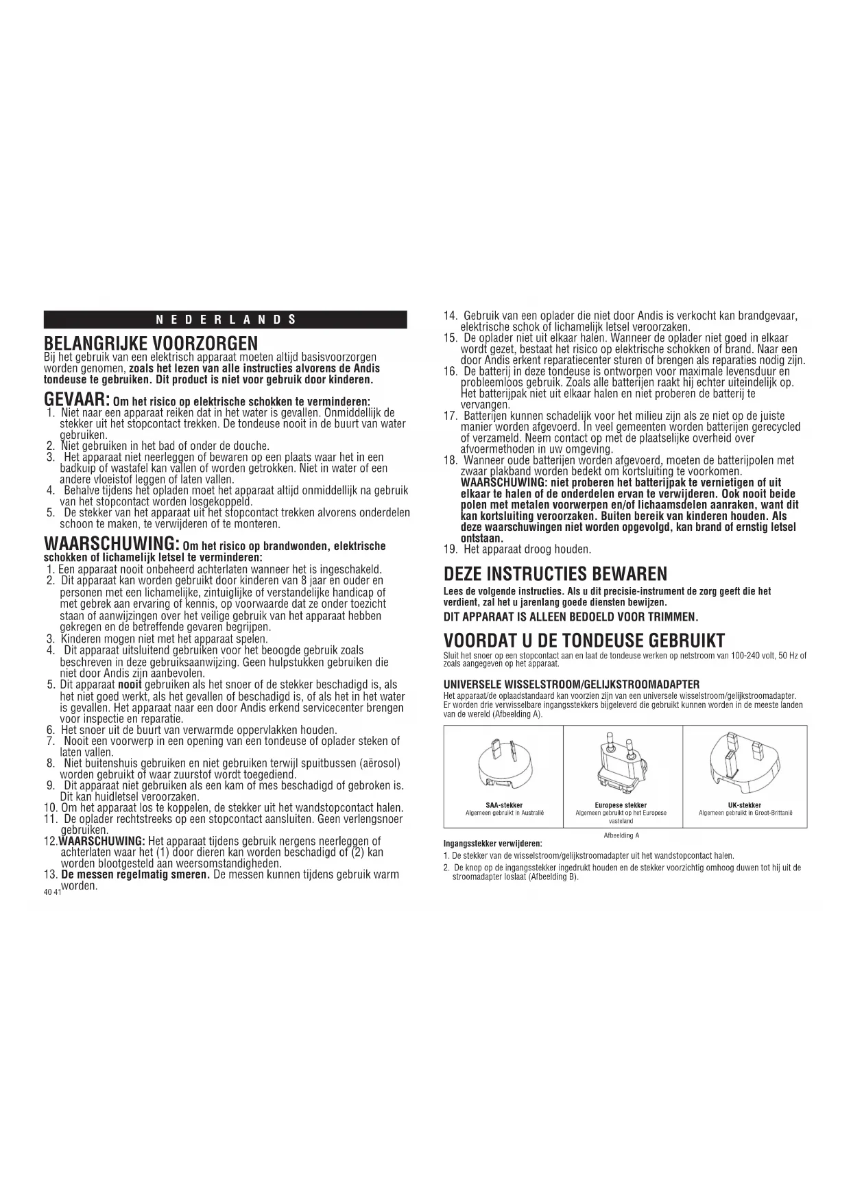 Bij het grabuik van een elektrisch apparaat要去en altijd basisvoorzorgen worden genomen, zoals het lezen van alle instructies alvorens de Andis tondeuse te gebruiken. Dit product is Niet voor grabuik door kinderen.