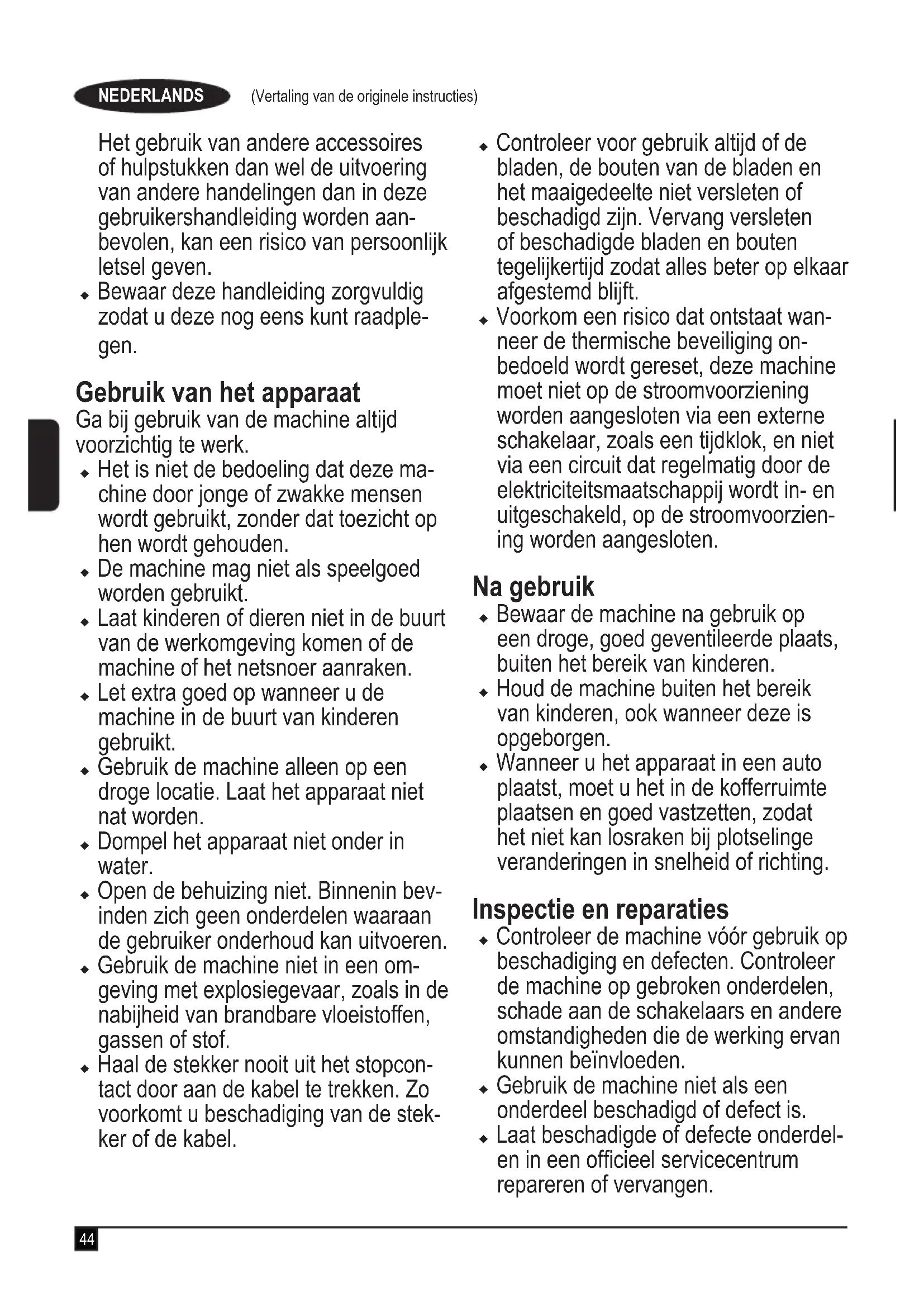 u Sla linksaf, stap over de kabel en ga verder naar positie 4. u Herhaal bovenstaande procedure waar nodig. Waarschuwing! Werk niet in de richting van het snoer, zoals wordt getoond in afb. M1. EdgeMax™ Met EdgeMax™ (11) kunt u het gras maaien tot aan de rand van een muur of schutting (afb. N). Met EdgeMax™ kunt u ook de gazonranden netjes maaien (afb. N1). u Duw, terwijl de grasmaaier parallel loopt aan de rand van uw gazon, de machine langs de rand. Let erop dat de EdgeMax™ iets over de rand van het gazon komt (afb. N1). Opmerking: Wanneer het zij-uitwerphulpstuk is bevestigd kan de EdgeMax™ alleen aan de rechterzijde van de maaima- chine worden gebruikt. Overbelasting van de maaimachine Voorkom beschadiging door overbelasting, maai niet te veel gras tegelijkertijd. Ga langzamer maaien of verhoog de maaihoogte. Opslag Waarschuwing! Het roterende maaiblad kan ernstige verwondingen veroorzaken. Schakel de maaimachine uit door de hendel voor in-/uitschakelen (2) los te laten, neem de vei- ligheidssleutel uit, haal de accu uit de machine en til dan pas de machine op voor het transport en opslag. Berg de machine op een droge plaats op. Waarschuwing! Voorkom dat u uw vingers klemt, houd uw vingers weg bij de handgrepen wanneer u deze invouwt. Waarschuwing! Let erop dat u bij het invouwen van de handgrepen het snoer niet uitrekt of afklemt. Hierdoor kan het snoer beschadigd raken. U kunt de handgreep van de maaimachine gemakkelijk invouwen en de machine snel en handig opbergen. u Open de bevestigingen (6) van de onderste handgreep, terwijl u de handgreep vasthoudt , maar verwijder de bev- estigingen niet, en vouw de handgreep naar de voorzijde van de maaimachine, zoals wordt getoond in afbeelding