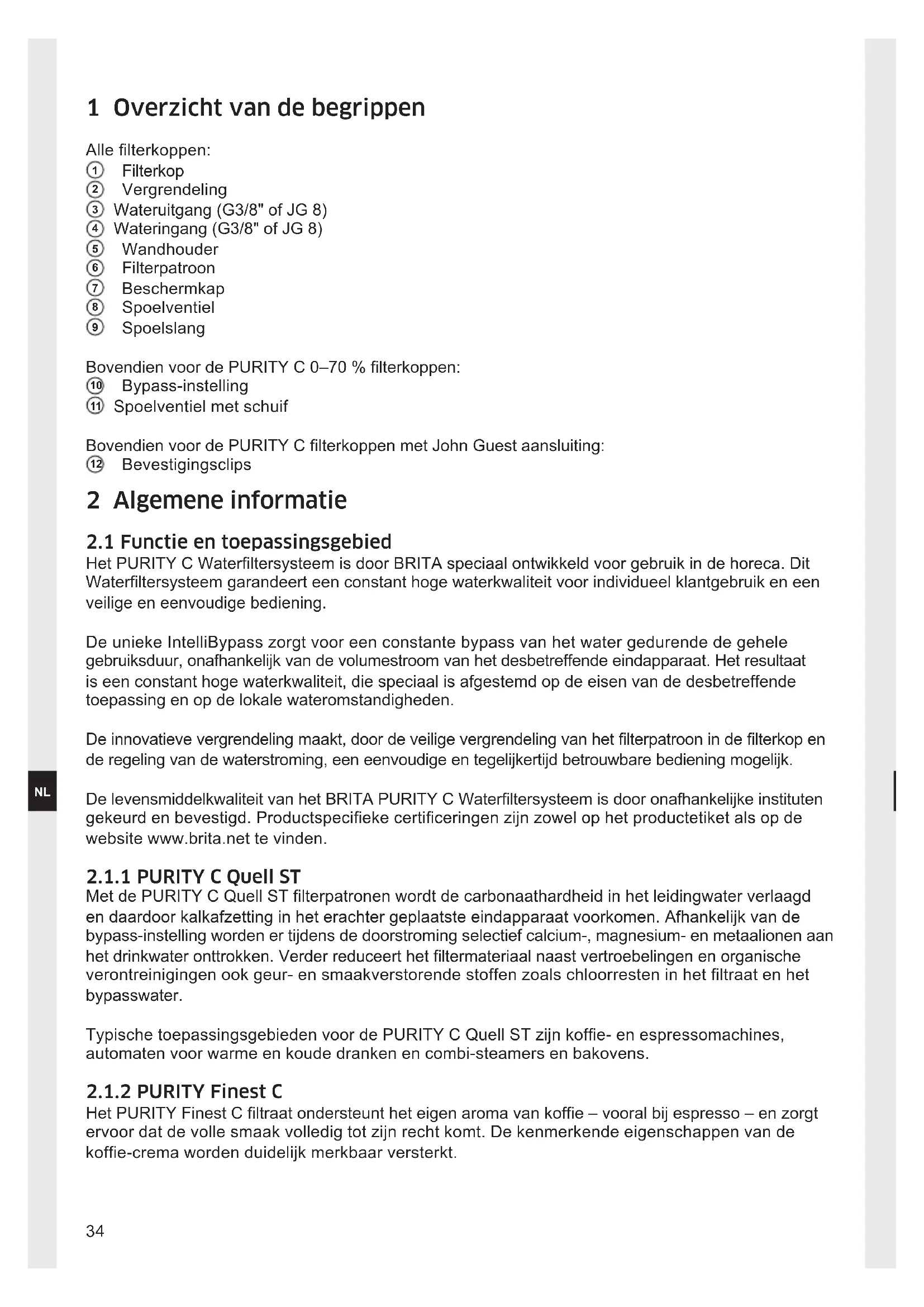 Het PURITY C Waterltersysteem is door BRITA speciaal ontwikkeld voor gebruik in de horeca. Dit Waterltersysteem garandeert een constant hoge waterkwaliteit voor individueel klantgebruik en een veilige en eenvoudige bediening. De unieke IntelliBypass zorgt voor een constante bypass van het water gedurende de gehele gebruiksduur, onafhankelijk van de volumestroom van het desbetreffende eindapparaat. Het resultaat is een constant hoge waterkwaliteit, die speciaal is afgestemd op de eisen van de desbetreffende toepassing en op de lokale wateromstandigheden. De innovatieve vergrendeling maakt, door de veilige vergrendeling van het lterpatroon in de lterkop en de regeling van de waterstroming, een eenvoudige en tegelijkertijd betrouwbare bediening mogelijk. De levensmiddelkwaliteit van het BRITA PURITY C Waterltersysteem is door onafhankelijke instituten gekeurd en bevestigd. Productspecieke certiceringen zijn zowel op het productetiket als op de website www.brita.net te vinden.