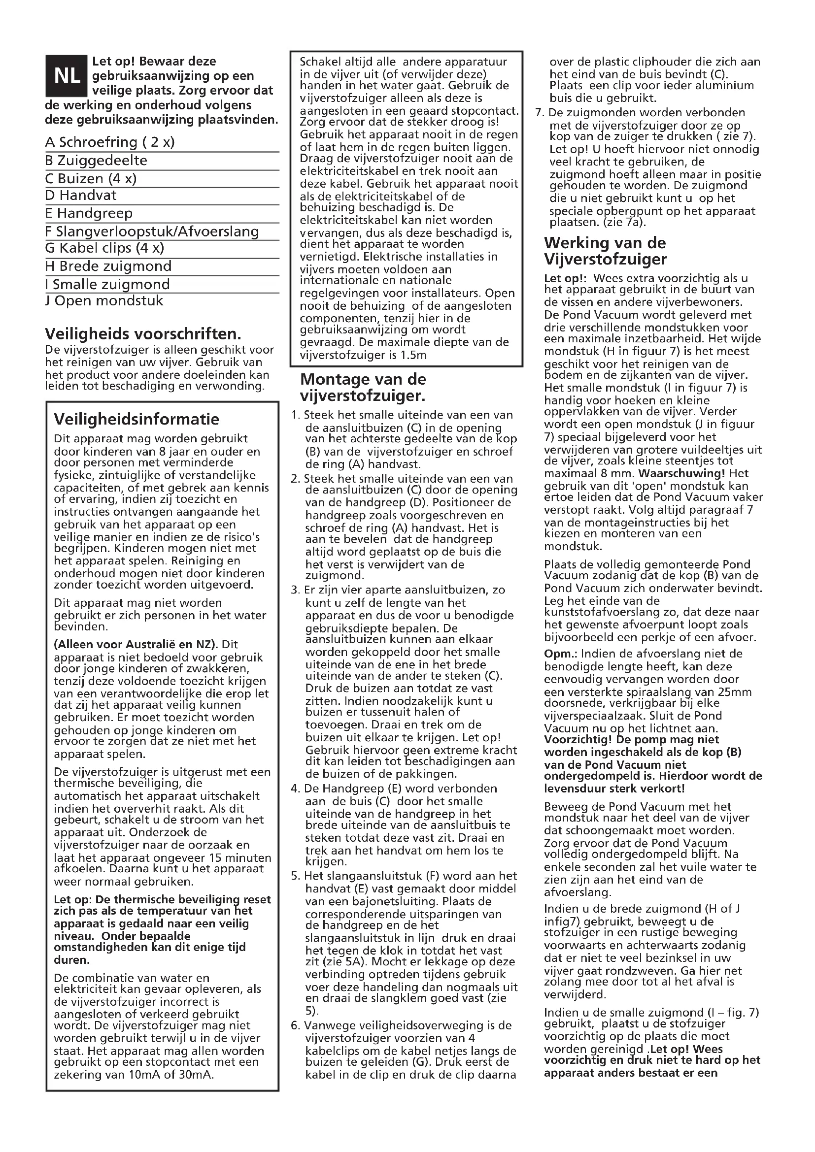 Let op!: Wees extra voorzichtig als u het apparaat gebruikt in de buurt van de vissen en andere vijverbewoners. De Pond Vacuum worden geleverd met drie verschillende mondstukken voor een maximale inzetbaarheid. Het wijde mondstuk (H in figuur 7) is het meest geschikt voor het reinigen van de bodem en de zijkanten van de vijver. Het smalle mondstuk (I in figuur 7) is handig voor hoeken enkleine oppervlakken van de vijver. Verder worden een open mondstuk (J in figuur 7) speciala bijgeleverd voor het verwijderen van grotere vuildeeltjesuit de vijver,zoalskleine steentjes tot maximaal 8mm .Waarschuwing! Het gebruik van dit open'mondstuk kan ertoe leiden dat de Pond Vacuum vaker verstopt raakt.Volg altojd paragraaf 7 van de montageinstructies bij het kiezen en monteren van een mondstuk.