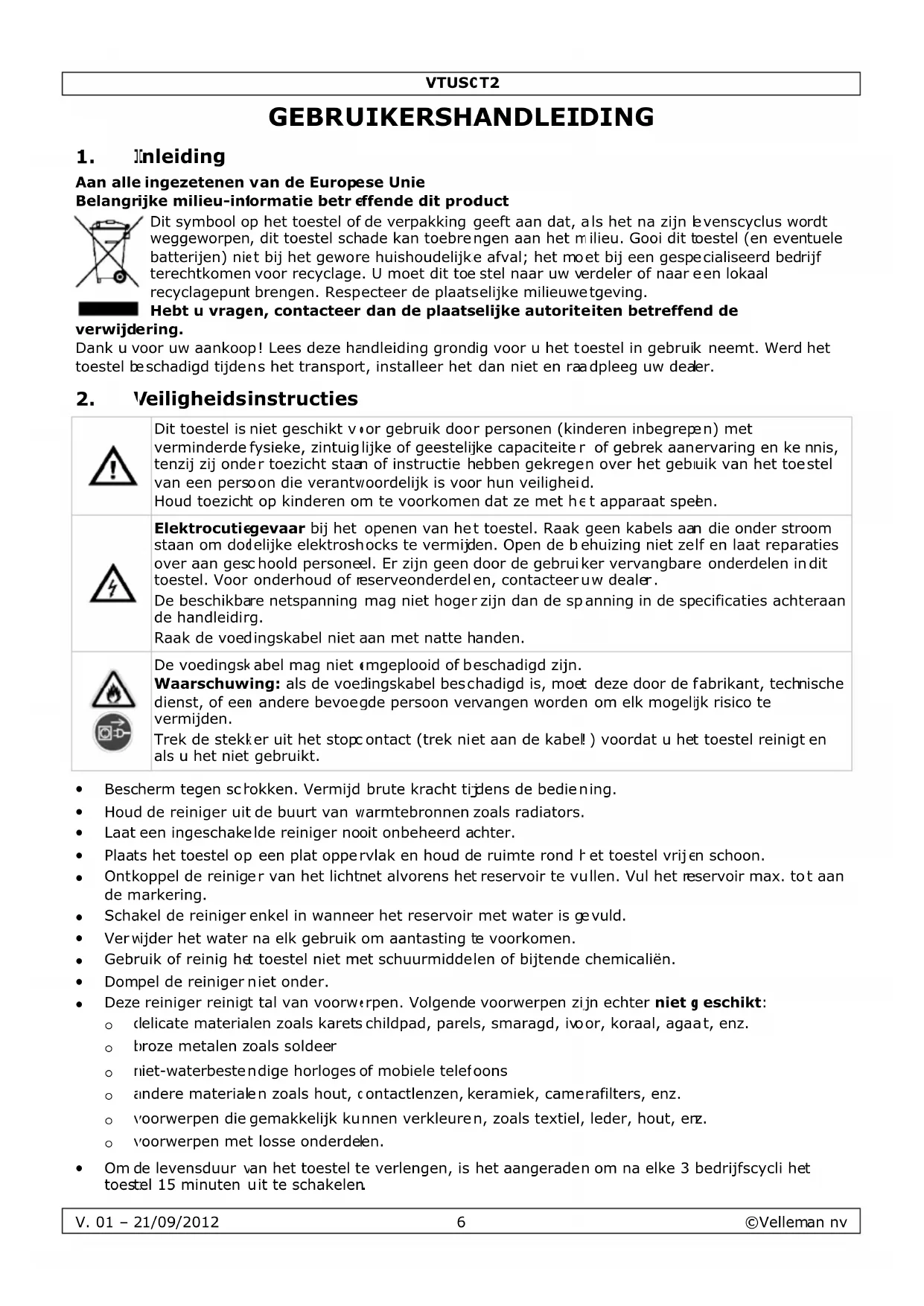 Download de handleiding voor uw Ultrasoonreiniger in PDF-formaat gratis! Vind uw handleiding VTUSCT2 - VELLEMAN en neem uw elektronisch apparaat weer in handen. Op deze pagina staan alle documenten die nodig zijn voor het gebruik van uw apparaat. VTUSCT2 van het merk VELLEMAN.