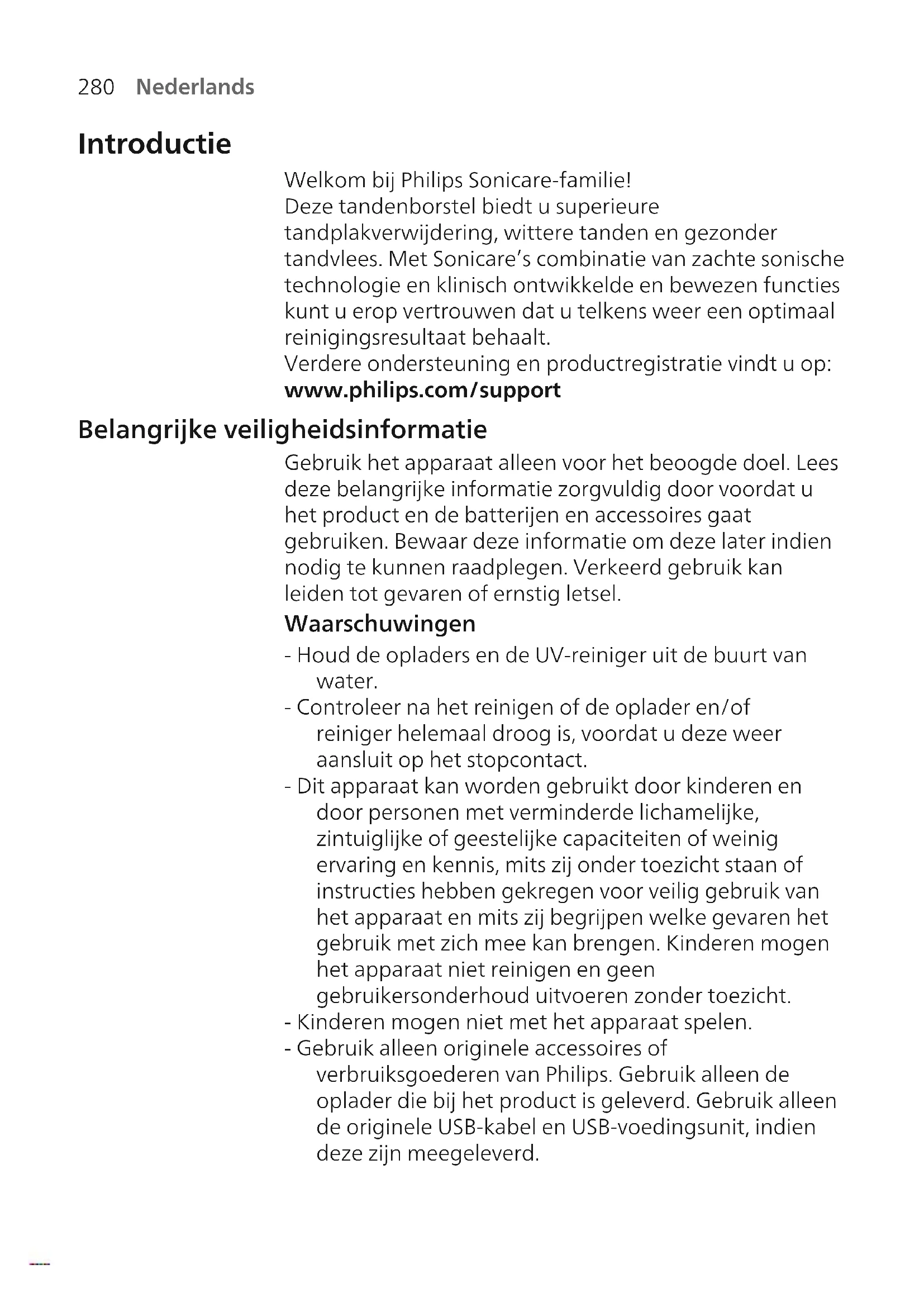 Nederlands Introductie Welkom bij Philips Sonicare-familie! Deze tandenborstel biedt u superieure tandplakverwijdering, wittere tanden en gezonder tandvlees. Met Sonicare’s combinatie van zachte sonische technologie en klinisch ontwikkelde en bewezen functies kunt u erop vertrouwen dat u telkens weer een optimaal reinigingsresultaat behaalt. Verdere ondersteuning en productregistratie vindt u op: www.philips.com/support Belangrijke veiligheidsinformatie Gebruik het apparaat alleen voor het beoogde doel. Lees deze belangrijke informatie zorgvuldig door voordat u het product en de batterijen en accessoires gaat gebruiken. Bewaar deze informatie om deze later indien nodig te kunnen raadplegen. Verkeerd gebruik kan leiden tot gevaren of ernstig letsel. Waarschuwingen - Houd de opladers en de UV-reiniger uit de buurt van water. - Controleer na het reinigen of de oplader en/of reiniger helemaal droog is, voordat u deze weer aansluit op het stopcontact. - Dit apparaat kan worden gebruikt door kinderen en door personen met verminderde lichamelijke, zintuiglijke of geestelijke capaciteiten of weinig ervaring en kennis, mits zij onder toezicht staan of instructies hebben gekregen voor veilig gebruik van het apparaat en mits zij begrijpen welke gevaren het gebruik met zich mee kan brengen. Kinderen mogen het apparaat niet reinigen en geen gebruikersonderhoud uitvoeren zonder toezicht. - Kinderen mogen niet met het apparaat spelen. - Gebruik alleen originele accessoires of verbruiksgoederen van Philips. Gebruik alleen de oplader die bij het product is geleverd. Gebruik alleen de originele USB-kabel en USB-voedingsunit, indien deze zijn meegeleverd.281 Nederlands - Dit apparaat bevat geen onderdelen die door de gebruiker gerepareerd kunnen worden. Gebruik het apparaat niet meer als het beschadigd is en neem contact op met het Klantenservice in uw land. Alleen bij apparaten met snoer: als het snoer beschadigd is, vervang dan de oplader met de reiniger door een nieuwe. - Gebruik de oplader en/of reiniger niet buitenshuis of in de buurt van hete oppervlakken. - Maak geen enkel onderdeel van het product schoon in de vaatwasmachine. - Dit apparaat is alleen bedoeld voor de reiniging van tanden, tandvlees en de tong. - Houd de uv-reiniger altijd buiten het bereik van kinderen. - Stop met het gebruik van de UV-reiniger als de UV- lamp blijft branden wanneer het deurtje open staat. uv-licht kan schadelijk zijn voor ogen en huid. - Gebruik de reiniger alleen als het afdekscherm op zijn plaats zit. - Raak de UV-lamp van de UV-reiniger niet aan wanneer deze heet is. - Gebruik een opzetborstel niet als de borstelharen verbogen of geknakt zijn. Vervang de opzetborstel elke 3 maanden of eerder indien deze tekenen van slijtage vertoont. - Vermijd direct contact met producten die essentiële oliën of kokosolie bevatten. Als gevolg van dergelijk contact kunnen borstelharen losraken. - Stop met het gebruik van het apparaat en raadpleeg uw tandarts/arts als er na gebruik sprake is van overmatig bloeden, als er na 1 week gebruik nog steeds bloedingen optreden of als u ongemak of pijn ervaart. - Raadpleeg uw tandarts voordat u dit apparaat gebruikt als u in de afgelopen 2 maanden een chirurgische behandeling aan uw mond of uw tandvlees hebt ondergaan.282 Nederlands - Als u een pacemaker of ander geïmplanteerd apparaat hebt, neemt u vóór gebruik van het apparaat contact op met uw arts of de fabrikant van het geïmplanteerde apparaat. - Raadpleeg uw arts voordat u dit apparaat gebruikt als u medische klachten hebt. - Dit apparaat is bedoeld voor thuisgebruik en is niet bedoeld om door meerdere personen te worden gebruikt in een tandartsenpraktijk of een instelling. Veiligheidsinstructies voor batterijen - Dit apparaat bevat batterijen die alleen door vakkundige personen mogen worden vervangen. - Gebruik het apparaat alleen voor het beoogde doel. Lees deze informatie zorgvuldig door voordat u het product en de batterijen en accessoires gaat gebruiken. Bewaar het boekje om het indien nodig later te kunnen raadplegen. Verkeerd gebruik kan leiden tot gevaren of ernstig letsel. De meegeleverde accessoires kunnen per product verschillen. - Gebruik alleen originele accessoires en verbruiksgoederen van Philips. Gebruik alleen de verwijderbare voedingen TCBxxxx, HX6100, HX6110, HX6160 of WAAxxxx. - Houd het product en de batterijen uit de buurt van vuur en stel ze niet bloot aan direct zonlicht of hoge temperaturen. - Als het product erg heet wordt, een abnormale geur afgeeft, van kleur verandert of als het opladen veel langer duurt dan gewoonlijk, mag u het product niet meer gebruiken of opladen. Neem contact op met Philips. - Plaats producten en bijbehorende batterijen niet in een magnetron of op een inductiekookplaat. - Om te voorkomen dat batterijen te heet worden of giftige of gevaarlijke stoffen afgeven, mag u het product en de batterij niet openen, aanpassen, doorboren, beschadigen of uit elkaar nemen. Sluit de batterijen niet kort, laad ze niet te veel op en let bij het opladen op de juiste polariteit.283 Nederlands - Dit apparaat bevat batterijen die niet vervangbaar zijn. Als de batterij het einde van de levensduur heeft bereikt, moet het apparaat op de juiste wijze worden afgevoerd. Raadpleeg hiervoor de paragraaf over recycling. - Als batterijen beschadigd zijn of lekken, dient u contact met de huid of ogen te vermijden. Als er toch contact met de huid of ogen optreedt, spoel dan onmiddellijk grondig met water en roep medische hulp in. - Zorg dat uw handen, het product en de batterijen droog zijn wanneer u de batterijen hanteert. - Laat de batterijaansluitingen niet in aanraking komen met een metalen voorwerp (zoals een munt, haarspeld of ring) om te voorkomen dat de batterijen na verwijdering kortsluiten. Wikkel batterijen niet in aluminiumfolie. Plak de batterijpolen af met tape of doe de batterijen in een plastic zak voordat u ze weggooit. - Laad het product op en gebruik en bewaar het bij een temperatuur tusse