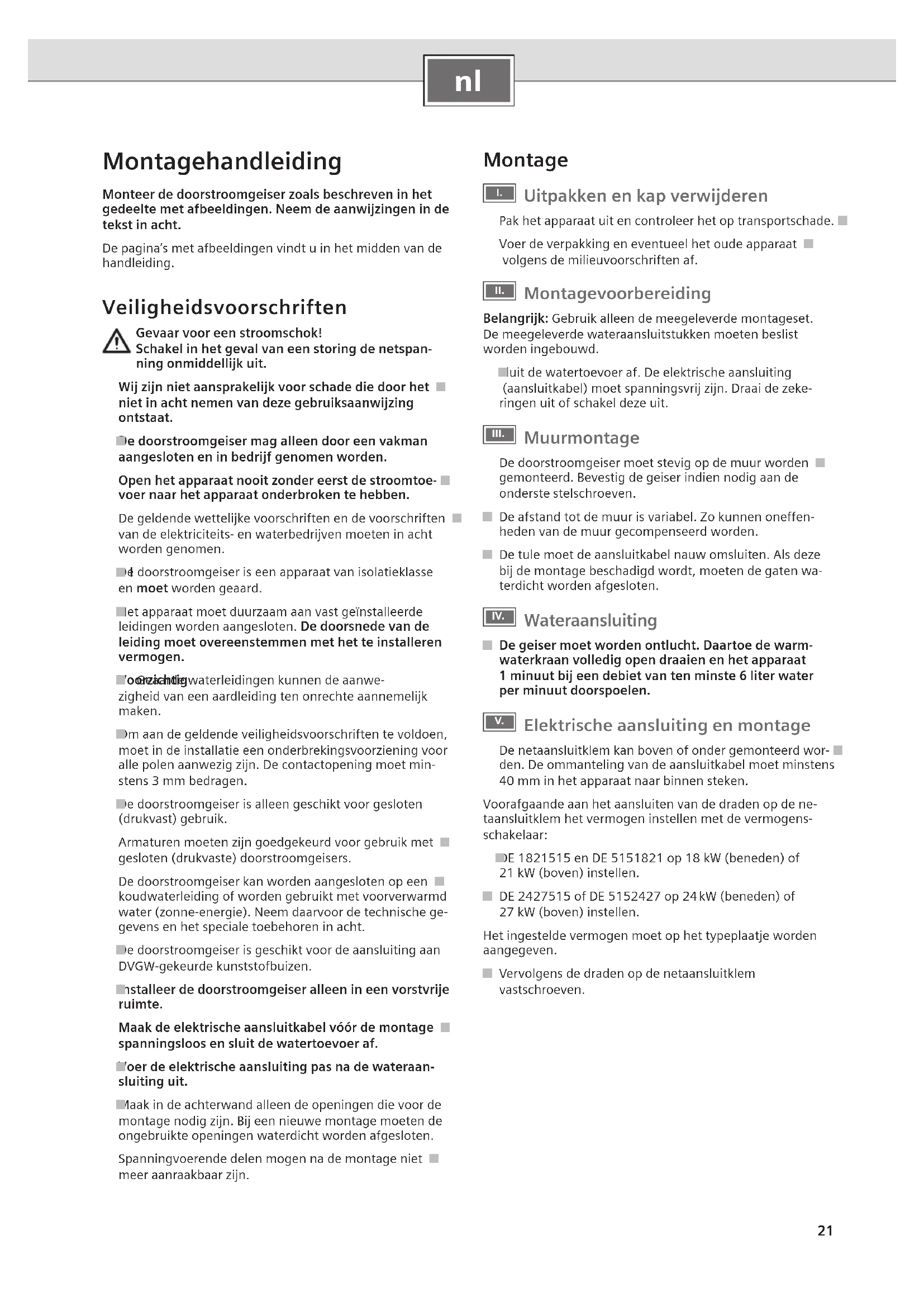 Montagehandleiding Monteer de doorstroomgeiser zoals beschreven in het gedeelte met afbeeldingen. Neem de aanwijzingen in de tekst in acht.De pagina’s met afbeeldingen vindt u in het midden van de handleiding. Veiligheidsvoorschriften Gevaar voor een stroomschok!Schakel in het geval van een storing de netspan-ning onmiddellijk uit.Wij zijn niet aansprakelijk voor schade die door het ■niet in acht nemen van deze gebruiksaanwijzing ontstaat.De doorstroomgeiser mag alleen door een vakman ■aangesloten en in bedrijf genomen worden.Open het apparaat nooit zonder eerst de stroomtoe- ■voer naar het apparaat onderbroken te hebben.De geldende wettelijke voorschriften en de voorschriften ■van de elektriciteits- en waterbedrijven moeten in acht worden genomen.De doorstroomgeiser is een apparaat van isolatieklasse ■ I en moet worden geaard.Het apparaat moet duurzaam aan vast geïnstalleerde ■leidingen worden aangesloten. De doorsnede van de leiding moet overeenstemmen met het te installeren vermogen.Voorzichtig ■ : Geaarde waterleidingen kunnen de aanwe-zigheid van een aardleiding ten onrechte aannemelijk maken.Om aan de geldende veiligheidsvoorschriften te voldoen, ■moet in de installatie een onderbrekingsvoorziening voor alle polen aanwezig zijn. De contactopening moet min-stens 3 mm bedragen.De doorstroomgeiser is alleen geschikt voor gesloten ■(drukvast) gebruik.Armaturen moeten zijn goedgekeurd voor gebruik met ■gesloten (drukvaste) doorstroomgeisers.De doorstroomgeiser kan worden aangesloten op een ■koudwaterleiding of worden gebruikt met voorverwarmd water (zonne-energie). Neem daarvoor de technische ge-gevens en het speciale toebehoren in acht.De doorstroomgeiser is geschikt voor de aansluiting aan ■DVGW-gekeurde kunststofbuizen.Installeer de doorstroomgeiser alleen in een vorstvrije ■ruimte.Maak de elektrische aansluitkabel vóór de montage ■spanningsloos en sluit de watertoevoer af.Voer de elektrische aansluiting pas na de wateraan- ■sluiting uit.Maak in de achterwand alleen de openingen die voor de ■montage nodig zijn. Bij een nieuwe montage moeten de ongebruikte openingen waterdicht worden afgesloten.Spanningvoerende delen mogen na de montage niet ■meer aanraakbaar zijn. Montage