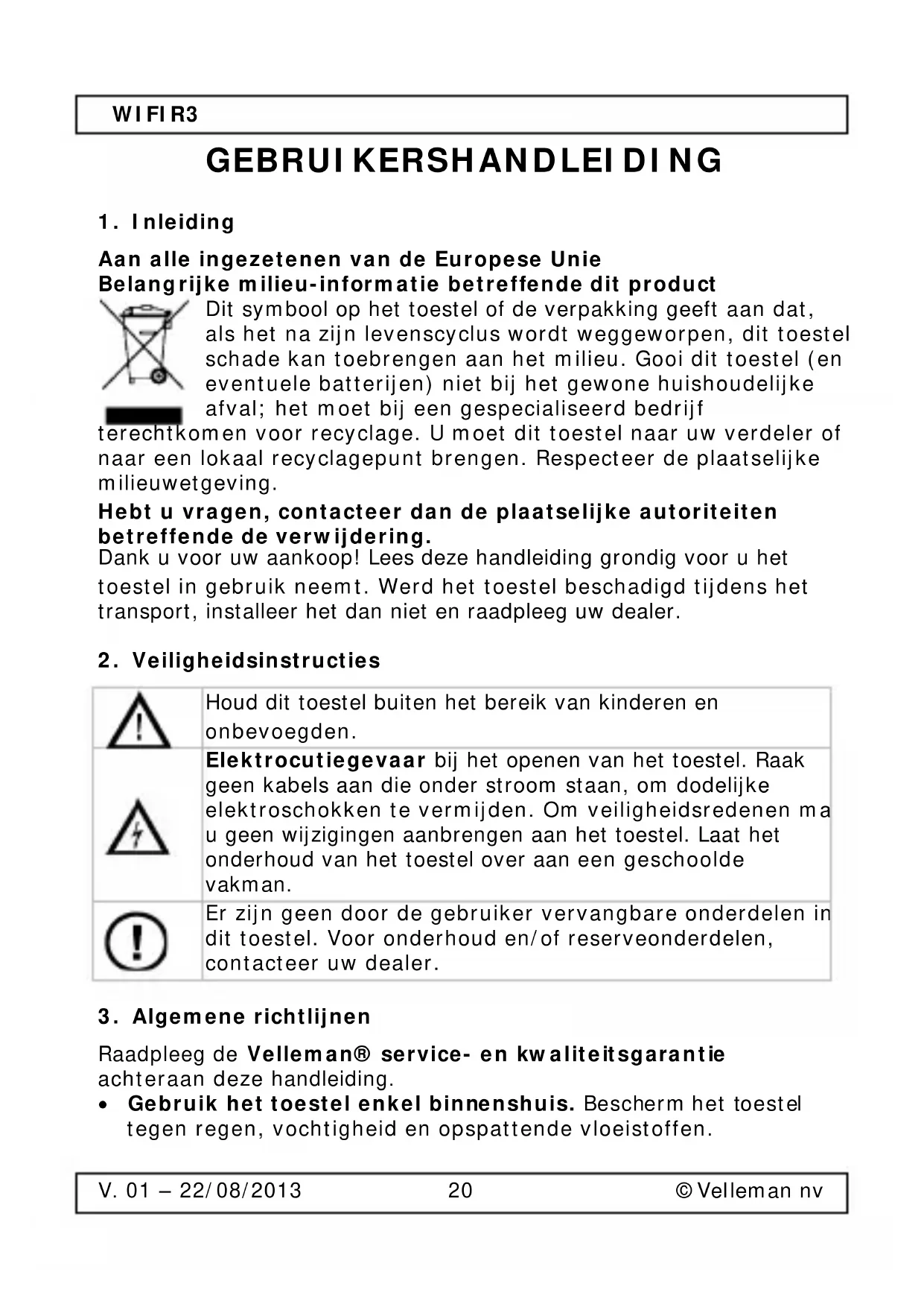Gebruik dit toestel enkel met originele accessoires. Velleman nv is niet aansprakelijk voor schade of kwetsuren bij (verkeerd) gebruik van dit toestel. Voor meer informatie overWIFIR3