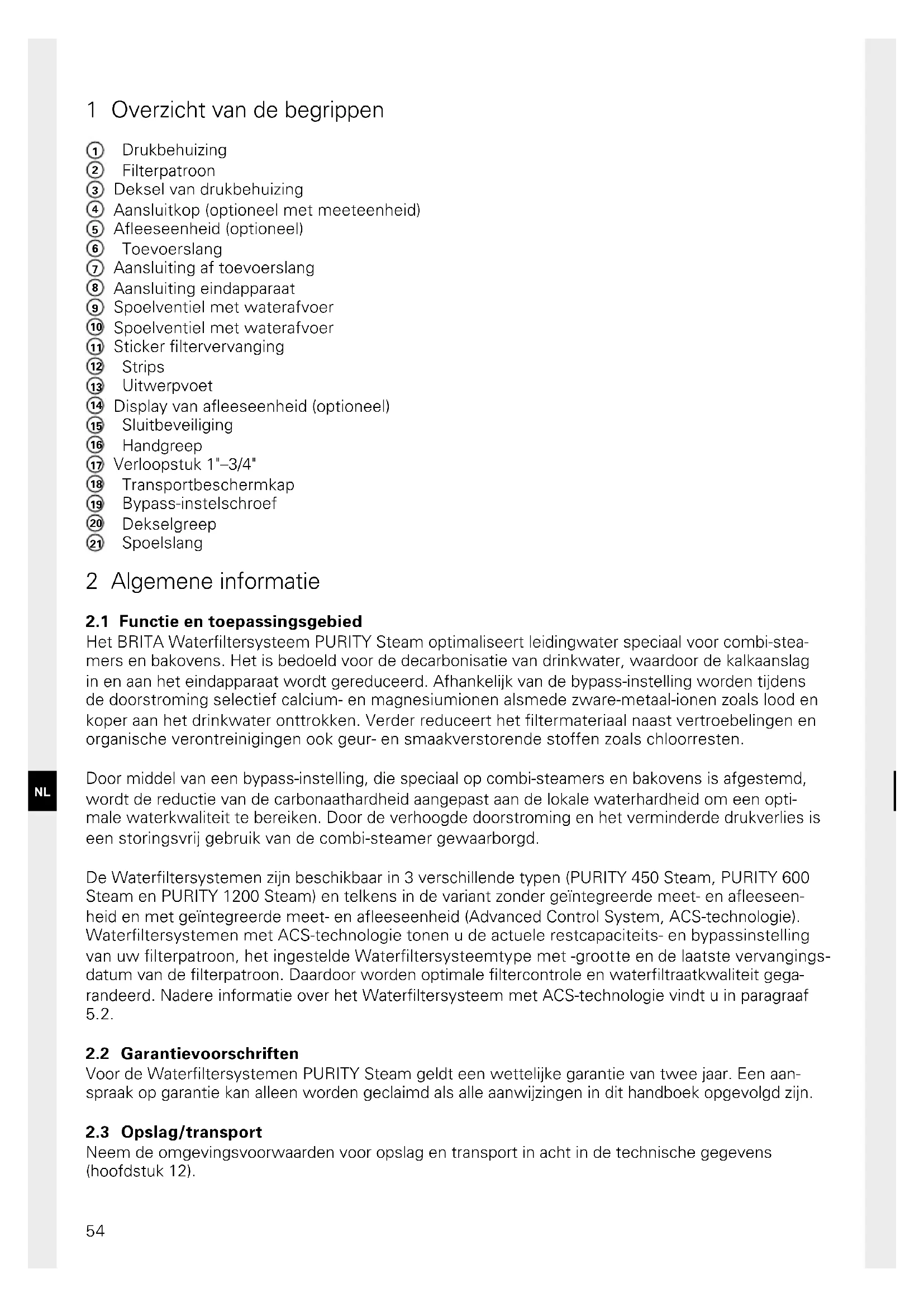 Neem de omgevingsvoorwaarden voor opslag en transport in acht in de technische gegevens (hoofdstuk 12). NL55 Het handboek moet als onderdeel van het product worden beschouwd en moet tijdens de gehele levensduur van het Waterfiltersysteem worden bewaard en aan de eventuele volgende eigenaar worden doorgegeven.