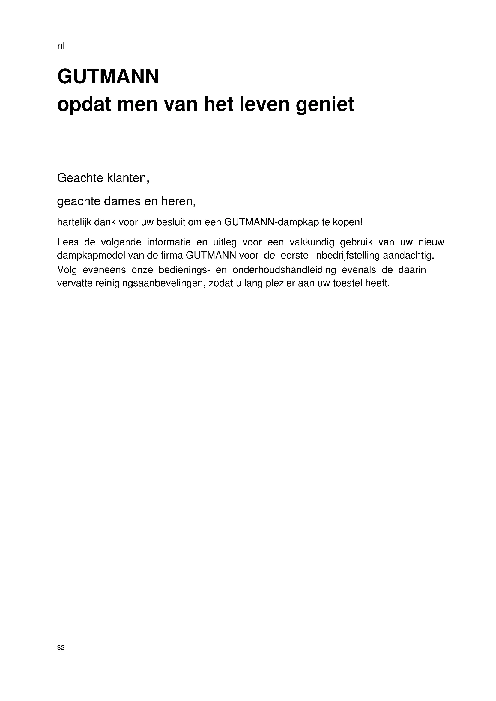 Geachte klanten, geachte dames en heren, hartelijk dank voor uw besluit om een GUTMANN-dampkap te kopen! Lees de volgende informatie en uitleg voor een vakkundig gebruik van uw nieuw dampkapmodel van de firma GUTMANN voor de eerste inbedrijfstelling aandachtig. Volg eveneens onze bedienings- en onderhoudshandleiding evenals de daarin vervatte reinigingsaanbevelingen, zodat u lang plezier aan uw toestel heeft.nl
