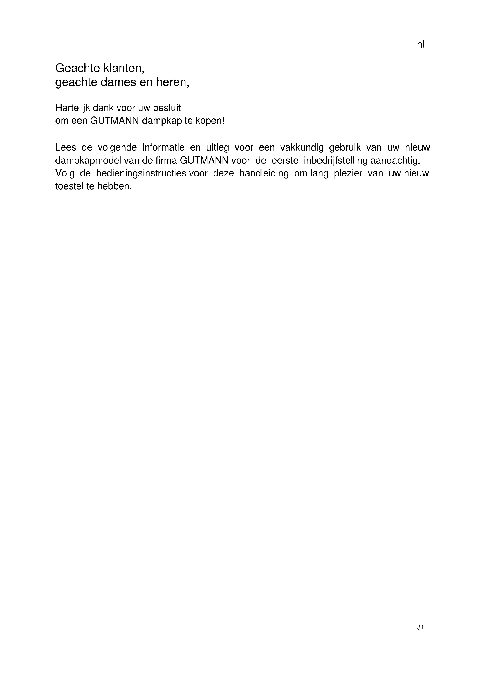 Geachte klanten, geachte dames en heren, Hartelijk dank voor uw besluit om een GUTMANN-dampkap te kopen! Lees de volgende informatie en uitleg voor een vakkundig gebruik van uw nieuw dampkapmodel van de firma GUTMANN voor de eerste inbedrijfstelling aandachtig. Volg de bedieningsinstructies voor deze handleiding om lang plezier van uw nieuw toestel te hebben.nl