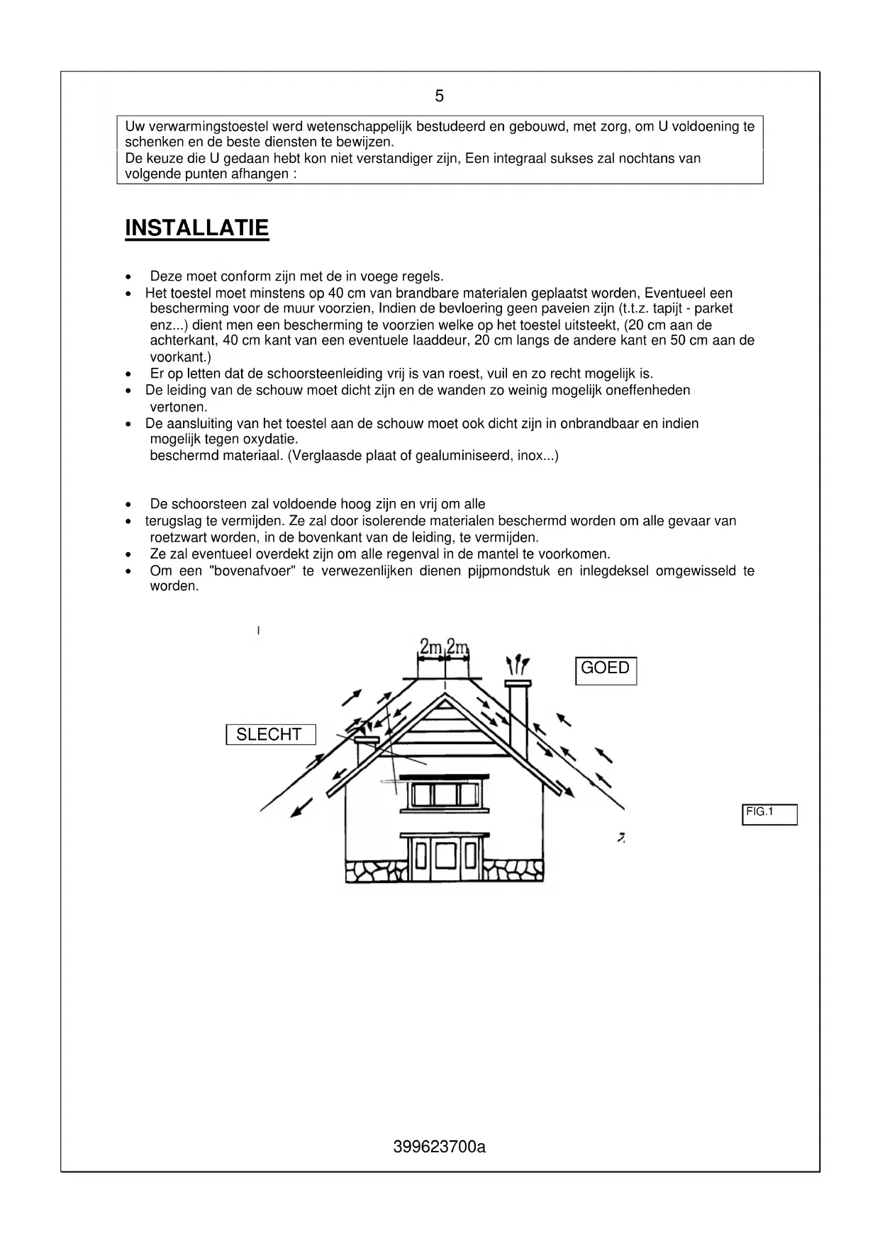 - Het toestel要去 minstens op 40 cm van brandbare materialen geplaatst worden, Eventeel een bescherming voor de muur voorzien, Indien de bevloering geen paveien zijn (t.t.z. tapijt - parket enz...) dient men een bescherming te voorzien welke op het toesteluitsteekt, (20 cm aan dechterkant, 40 cm kant van een eventuele laaddeur, 20 cm langs de andere kant en 50 cm aan devoorkant.)