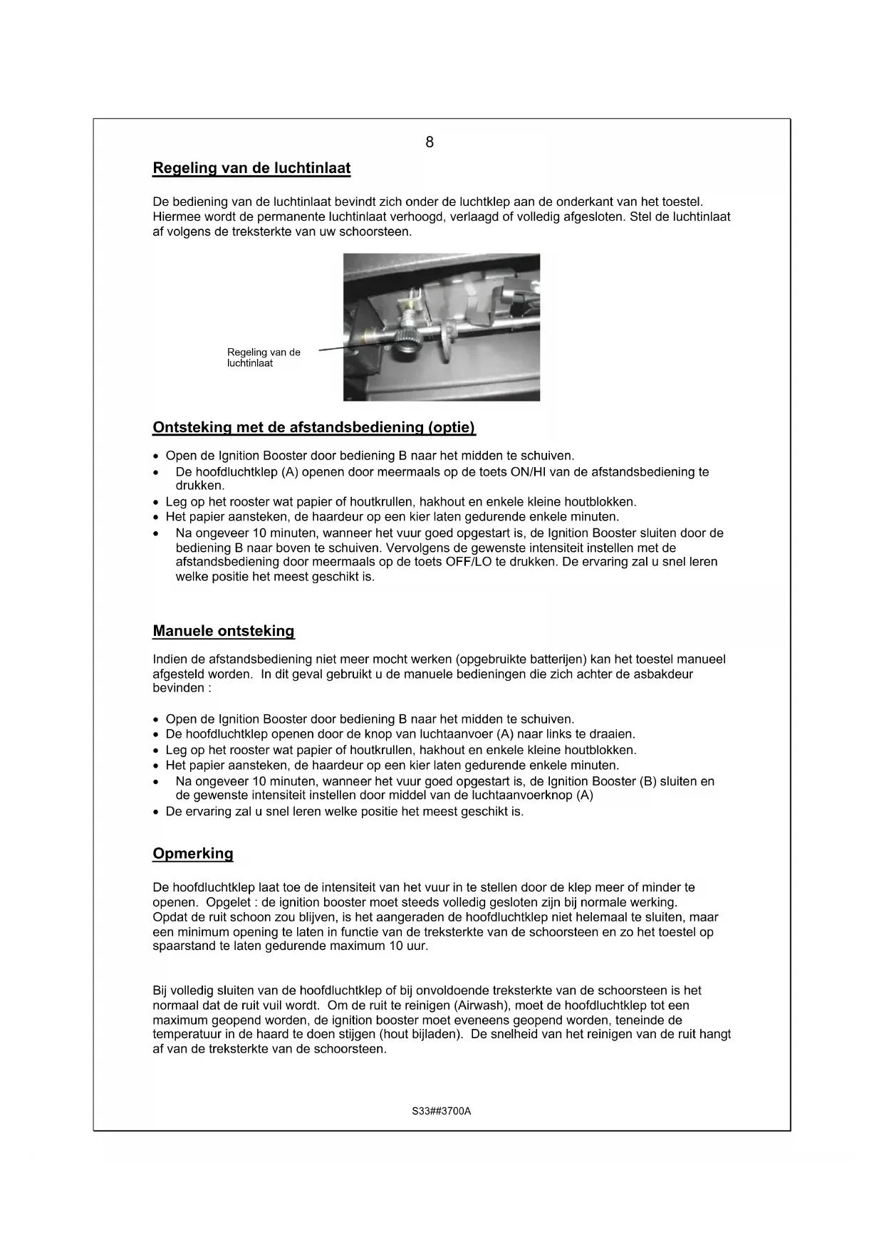 De hoofdluchtklep staat toe de intensiteit van het vuur in te stellen door de klepmeer of minder te openen. Opgelet : de ignition booster要去 steeds volledig gesloten+zijn bij normale werkinq. Opdat de ruit schoon zou blijven, is het aangeraden de hoofdluchtklep Niet hebemaal te sluiten, maar een minimum opening te lately in functie van de treksterkte van de schoorsteen en zo het toestel op spararstand te lately gedurende maximum 10 eer.