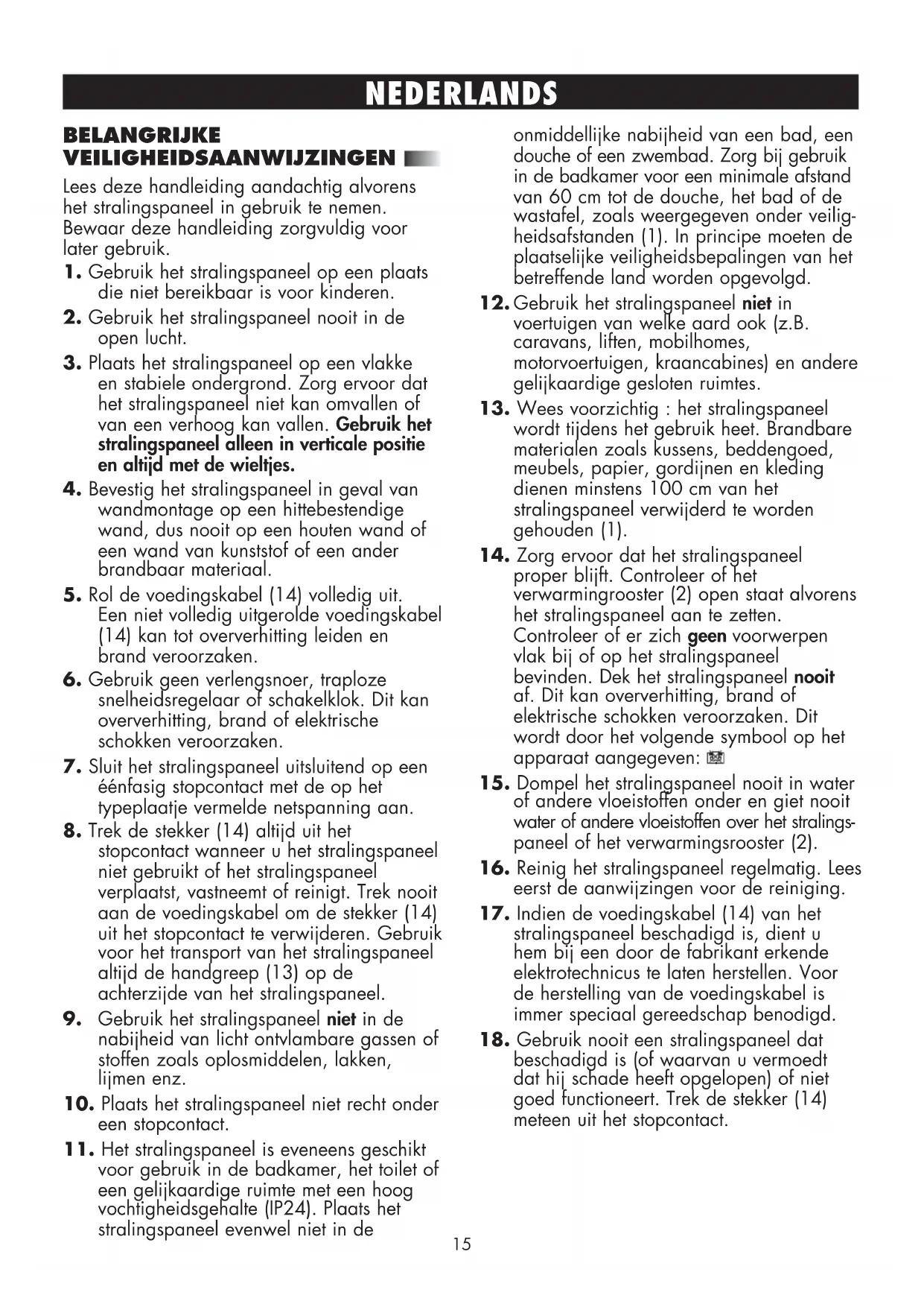 EXCLUS. Sous réserve de modifications techniques. 14NEDERLANDS BELANGRIJKE VEILIGHEIDSAANWIJZINGEN Lees deze handleiding aandachtig alvorens het stralingspaneel in gebruik te nemen. Bewaar deze handleiding zorgvuldig voor later gebruik.