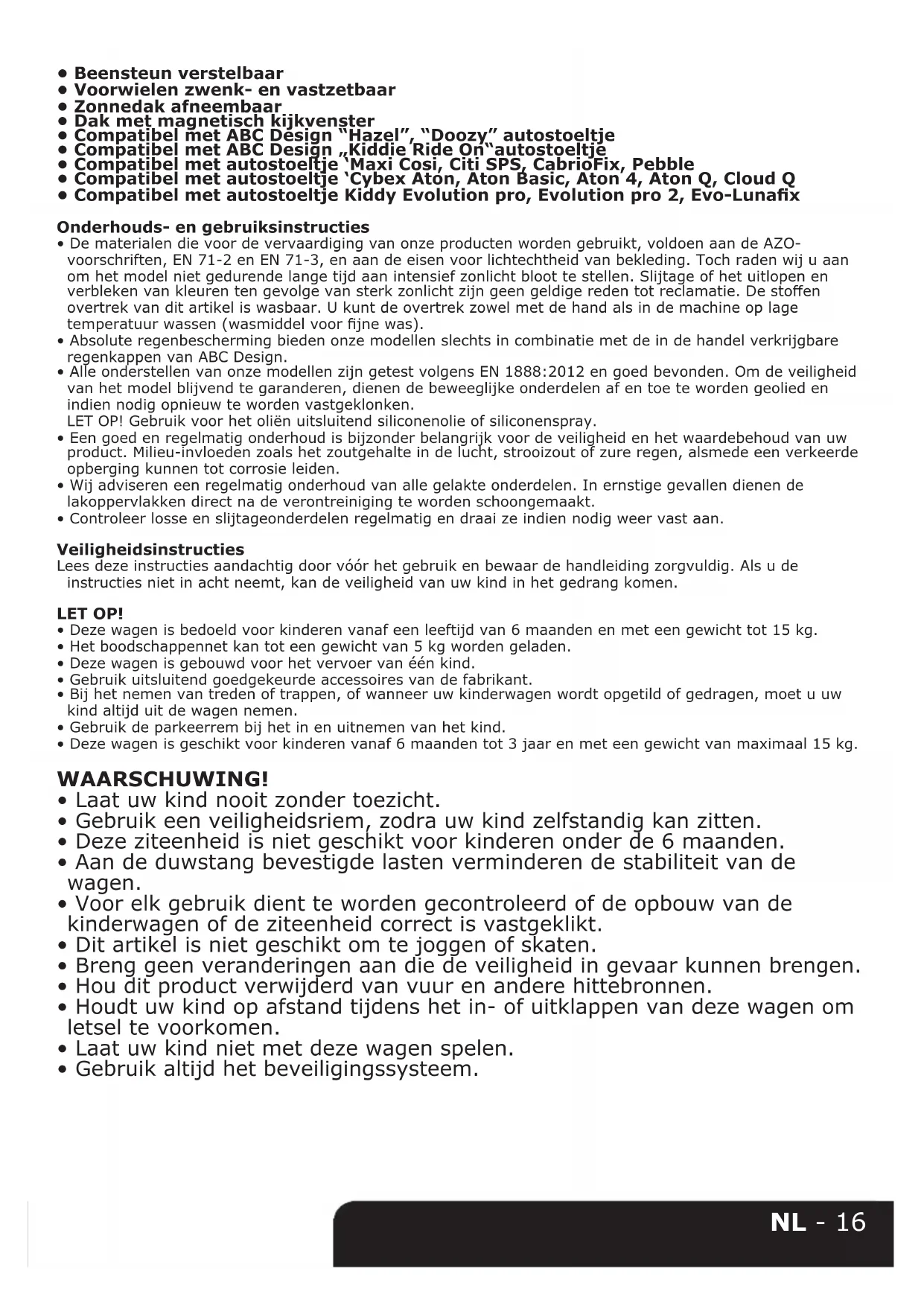 - Controleer losse en slijtageonderdelen regelmatig en draai ze indien nodig weer vast aan. Veiligheidsinstructies Lees deze instructies aandachtig door vóór het gebruik en bewaar de handleiding zorgvuldig. Als u de instructies niet in acht neemt, kan de veiligheid van uw kind in het gedrang komen. LET OP!