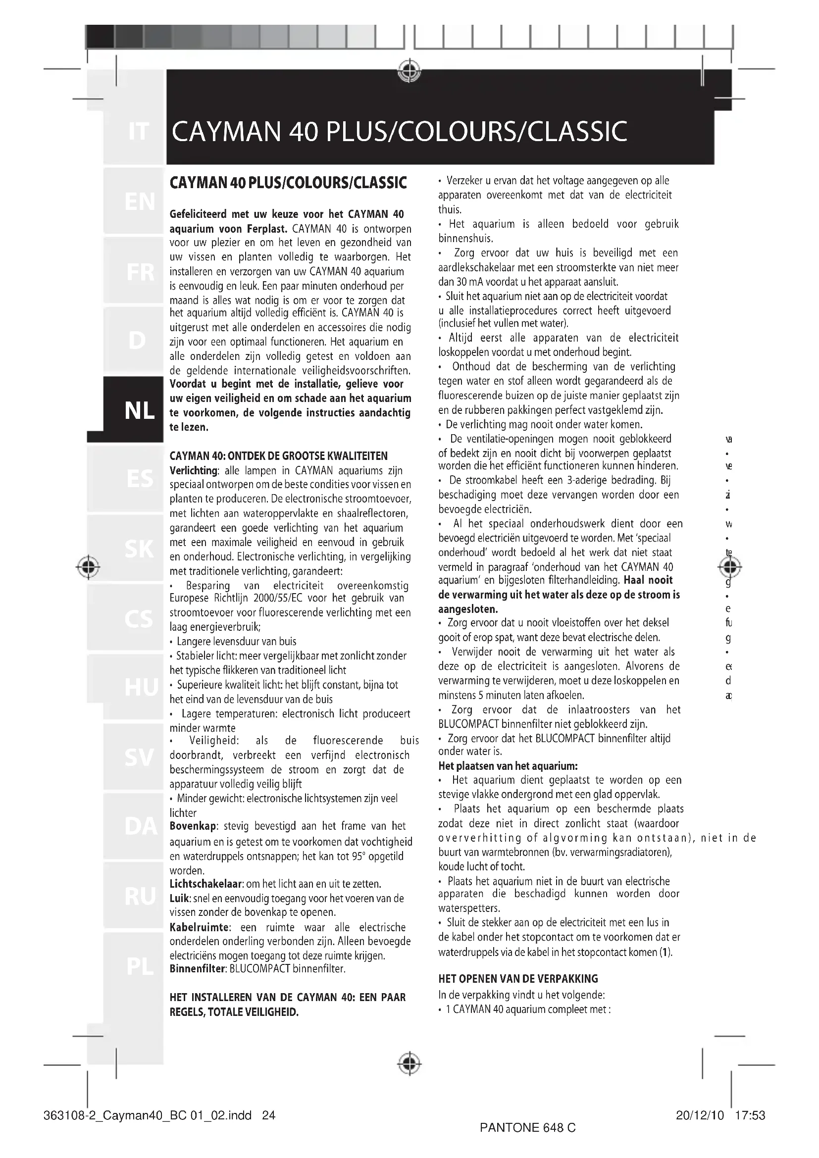 Gefeliciteerd met uw keuze voor het CAYMAN 40 aquarium voon Ferplast. CAYMAN 40 is ontworpen voor uw plezier en om het leven en gezondheid van uw vissen en planten volledig te waarborgen. Het installereren en verzorgen van uw CAYMAN 40 aquarium is eenvoudig en leuk. Eenaar minuten onderhoud per maand is alles wat nodig is om er voor te zorgen dat het aquarium algtd volledig efficiert is. CAYMAN 40 is uitergerust met alle onderdelen en accessoires die nodig maar voor een optimaal functioneren. Het aquarium en alle onderdelen zichn volledig getest en voldoen aan de geldende internationale veiligheidsvoorschriften. Voordat u begint met de installmentie, gelieve voor uw eigen veiligheid en om schade aan het aquarium te voorkomen, de volgende instructies aandachtig te lezen.