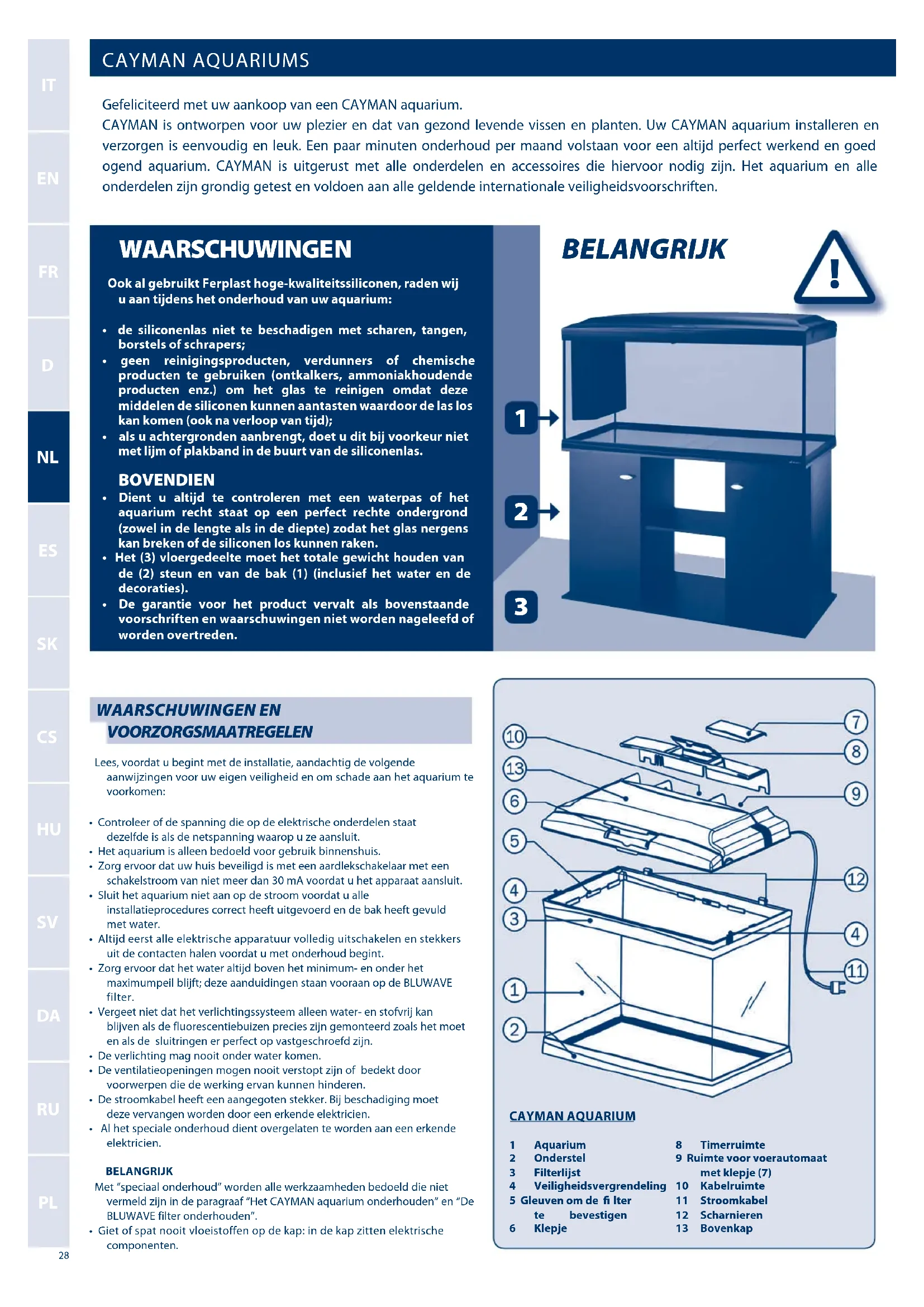 Alle onderdelen van het CAYMAN aquarium en de Ferplast filters zijn gemakkelijk te vervangen. De onderdelen zijn verkrijgbaar in de zaak waar u het aquarium hebt gekocht. Een volledige serie moderne accessoires van Ferplast is altijd beschikbaar om uw aquarium aan te passen aan elke persoonlijke wens. Gebruik alleen originele onderdelen van Ferplast om te kunnen rekenen op een probleemloos en veilig werkend aquarium. Als u onderdelen gebruikt die niet van Ferplast zijn, vervalt de garantie.
