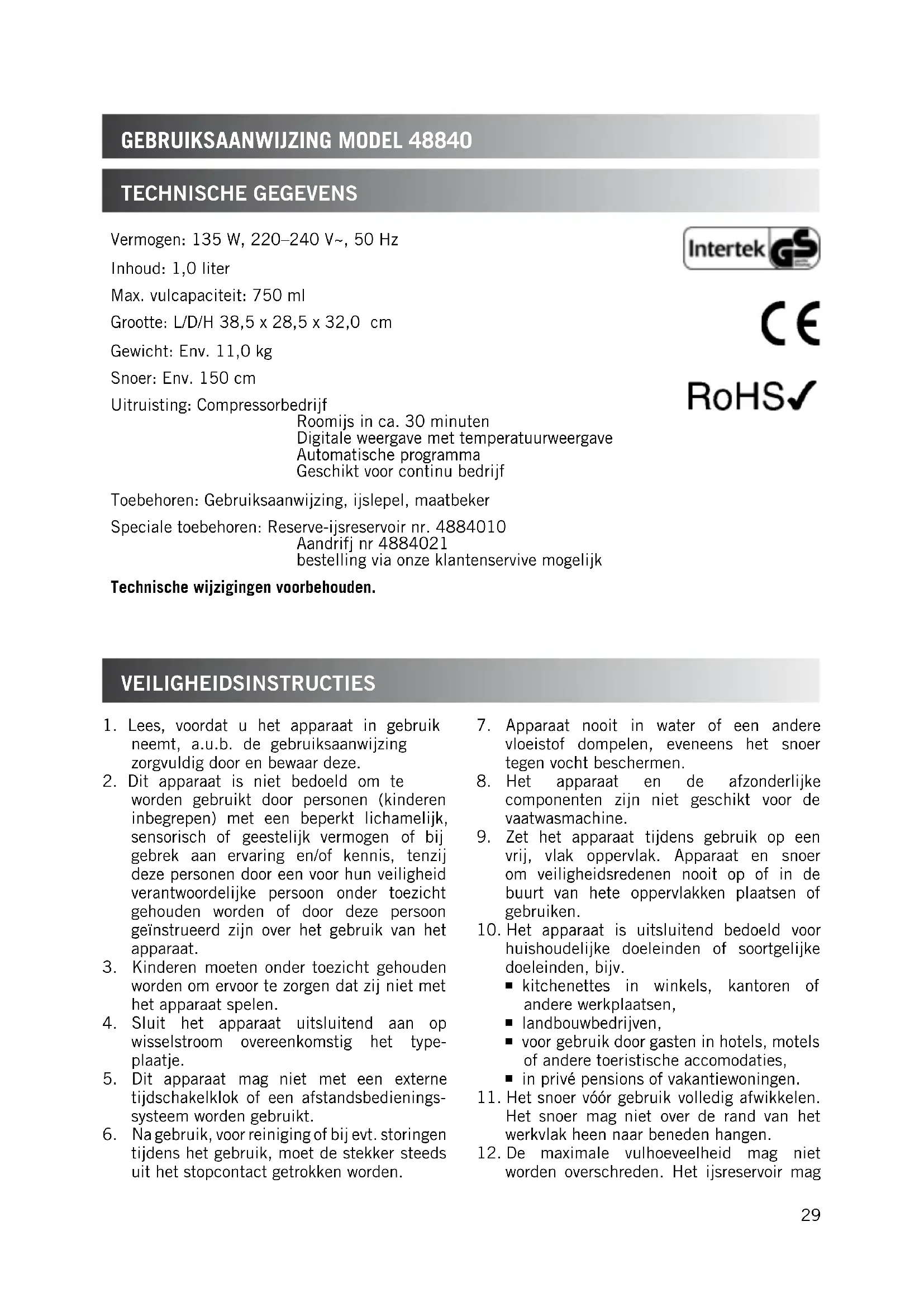 GEBRUIKSAANWIJZING MODEL 48840 VeiligheiDsinstructies technische gegeVens