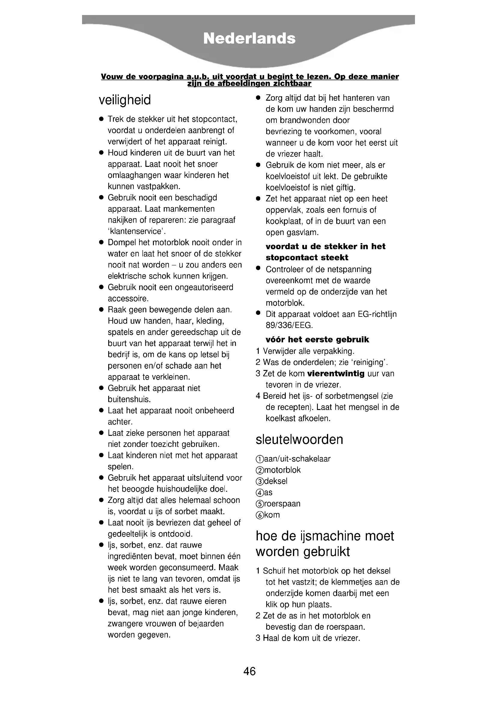 Dit apparaat voldoet aan EG-richtlijn 89/336/EEG. vóór het eerste gebruik 1 Verwijder alle verpakking. 2 Was de onderdelen; zie ‘reiniging’. 3 Zet de kom vierentwintig uur van tevoren in de vriezer. 4 Bereid het ijs- of sorbetmengsel (zie de recepten). Laat het mengsel in de koelkast afkoelen. sleutelwoorden aan/uit-schakelaar motorblok deksel
