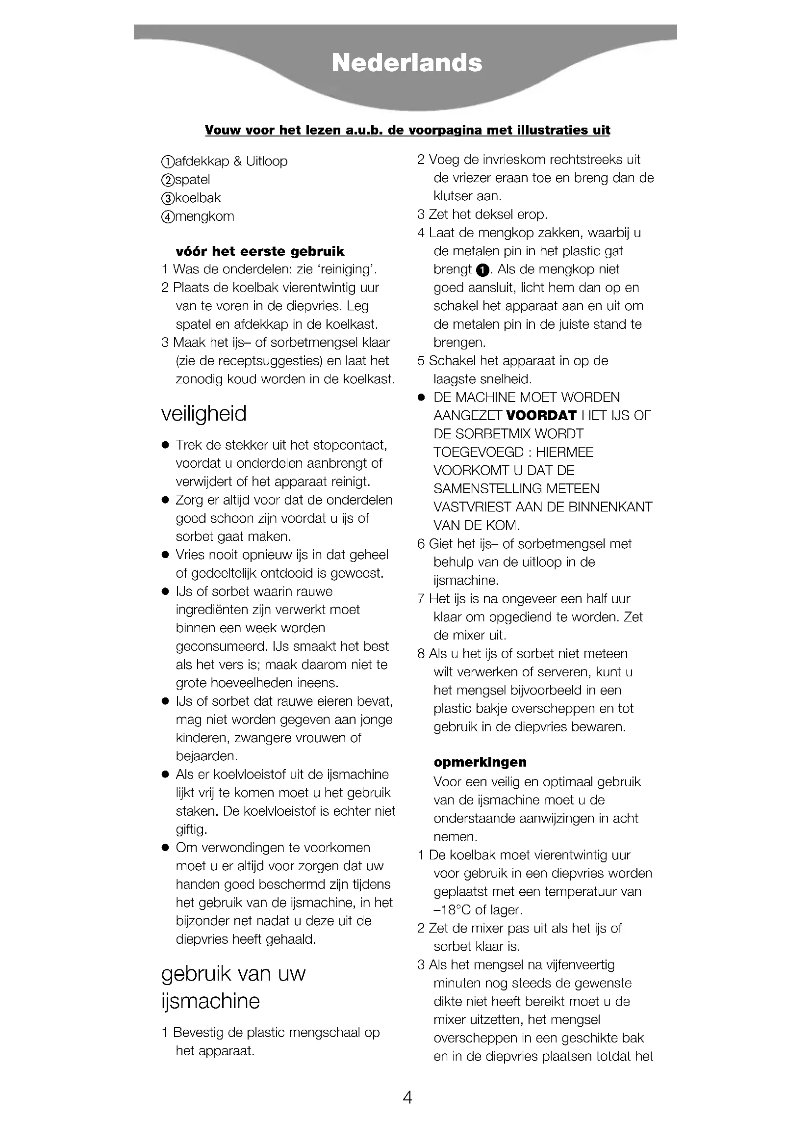 VAN DE KOM. 6 Giet het ijs– of sorbetmengsel met behulp van de uitloop in de ijsmachine. 7 Het ijs is na ongeveer een half uur klaar om opgediend te worden. Zet de mixer uit. 8 Als u het ijs of sorbet niet meteen wilt verwerken of serveren, kunt u het mengsel bijvoorbeeld in een plastic bakje overscheppen en tot gebruik in de diepvries bewaren. opmerkingen Voor een veilig en optimaal gebruik van de ijsmachine moet u de onderstaande aanwijzingen in acht nemen. 1 De koelbak moet vierentwintig uur voor gebruik in een diepvries worden geplaatst met een temperatuur van –18°C of lager. 2 Zet de mixer pas uit als het ijs of sorbet klaar is. 3 Als het mengsel na vijfenveertig minuten nog steeds de gewenste dikte niet heeft bereikt moet u de mixer uitzetten, het mengsel overscheppen in een geschikte bak en in de diepvries plaatsen totdat het