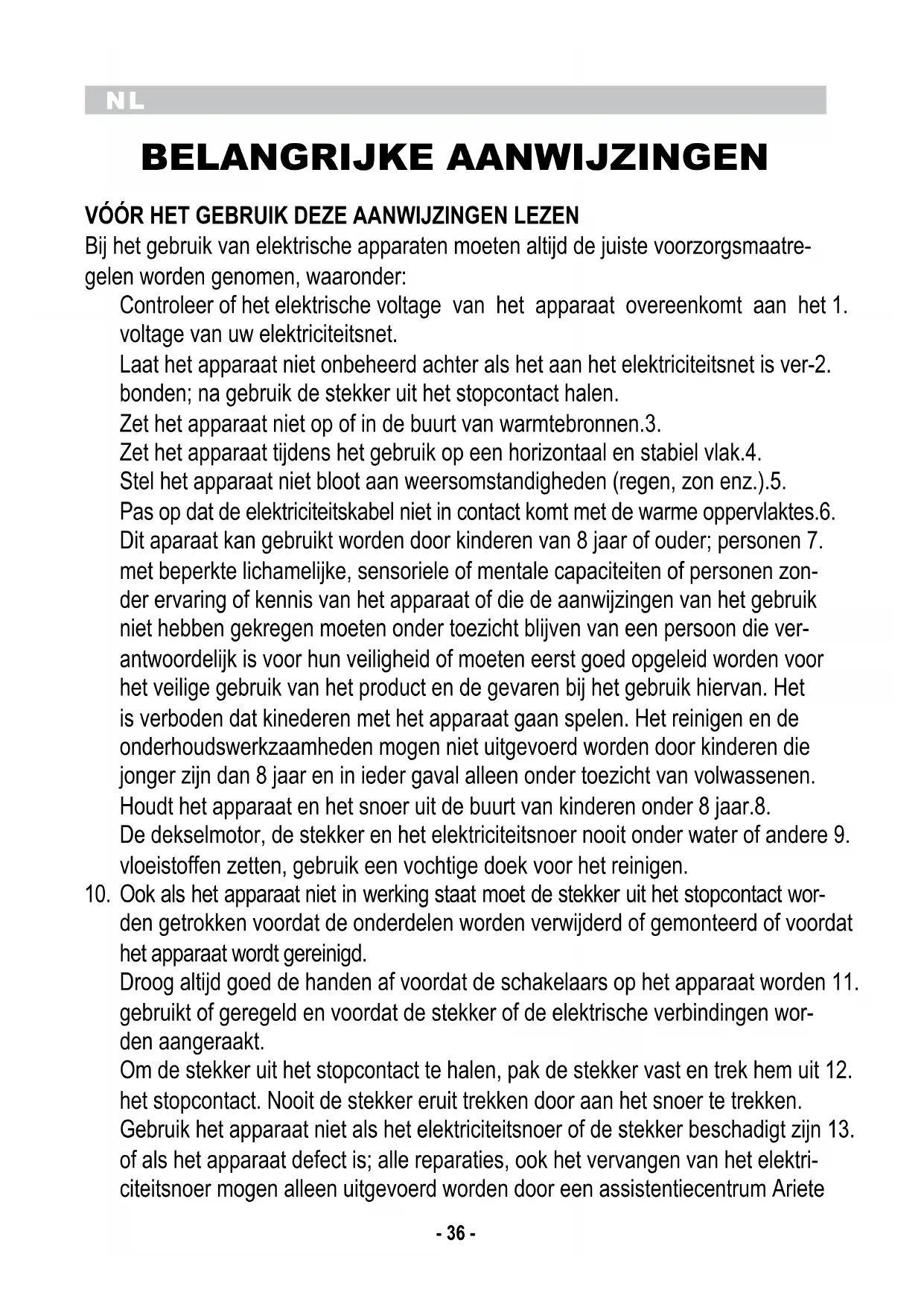 BELANGRIJKE AANWIJZINGEN VÓÓR HET GEBRUIK DEZE AANWIJZINGEN LEZEN Bij het gebruik van elektrische apparaten moeten altijd de juiste voorzorgsmaatre- gelen worden genomen, waaronder: Controleer of het elektrische voltage van het apparaat overeenkomt aan het 1. voltage van uw elektriciteitsnet. Laat het apparaat niet onbeheerd achter als het aan het elektriciteitsnet is ver-2. bonden; na gebruik de stekker uit het stopcontact halen. Zet het apparaat niet op of in de buurt van warmtebronnen.3. Zet het apparaat tijdens het gebruik op een horizontaal en stabiel vlak.4. Stel het apparaat niet bloot aan weersomstandigheden (regen, zon enz.).5. Pas op dat de elektriciteitskabel niet in contact komt met de warme oppervlaktes.6. Dit aparaat kan gebruikt worden door kinderen van 8 jaar of ouder; personen 7. met beperkte lichamelijke, sensoriele of mentale capaciteiten of personen zon- der ervaring of kennis van het apparaat of die de aanwijzingen van het gebruik niet hebben gekregen moeten onder toezicht blijven van een persoon die ver- antwoordelijk is voor hun veiligheid of moeten eerst goed opgeleid worden voor het veilige gebruik van het product en de gevaren bij het gebruik hiervan. Het is verboden dat kinederen met het apparaat gaan spelen. Het reinigen en de onderhoudswerkzaamheden mogen niet uitgevoerd worden door kinderen die jonger zijn dan 8 jaar en in ieder gaval alleen onder toezicht van volwassenen. Houdt het apparaat en het snoer uit de buurt van kinderen onder 8 jaar.8. De dekselmotor, de stekker en het elektriciteitsnoer nooit onder water of andere 9. vloeistoffen zetten, gebruik een vochtige doek voor het reinigen. Ook als het apparaat niet in werking staat moet de stekker uit het stopcontact wor-10. den getrokken voordat de onderdelen worden verwijderd of gemonteerd of voordat het apparaat wordt gereinigd. Droog altijd goed de handen af voordat de schakelaars op het apparaat worden 11. gebruikt of geregeld en voordat de stekker of de elektrische verbindingen wor- den aangeraakt. Om de stekker uit het stopcontact te halen, pak de stekker vast en trek hem uit 12. het stopcontact. Nooit de stekker eruit trekken door aan het snoer te trekken. Gebruik het apparaat niet als het elektriciteitsnoer of de stekker beschadigt zijn 13. of als het apparaat defect is; alle reparaties, ook het vervangen van het elektri- citeitsnoer mogen alleen uitgevoerd worden door een assistentiecentrum ArieteNL