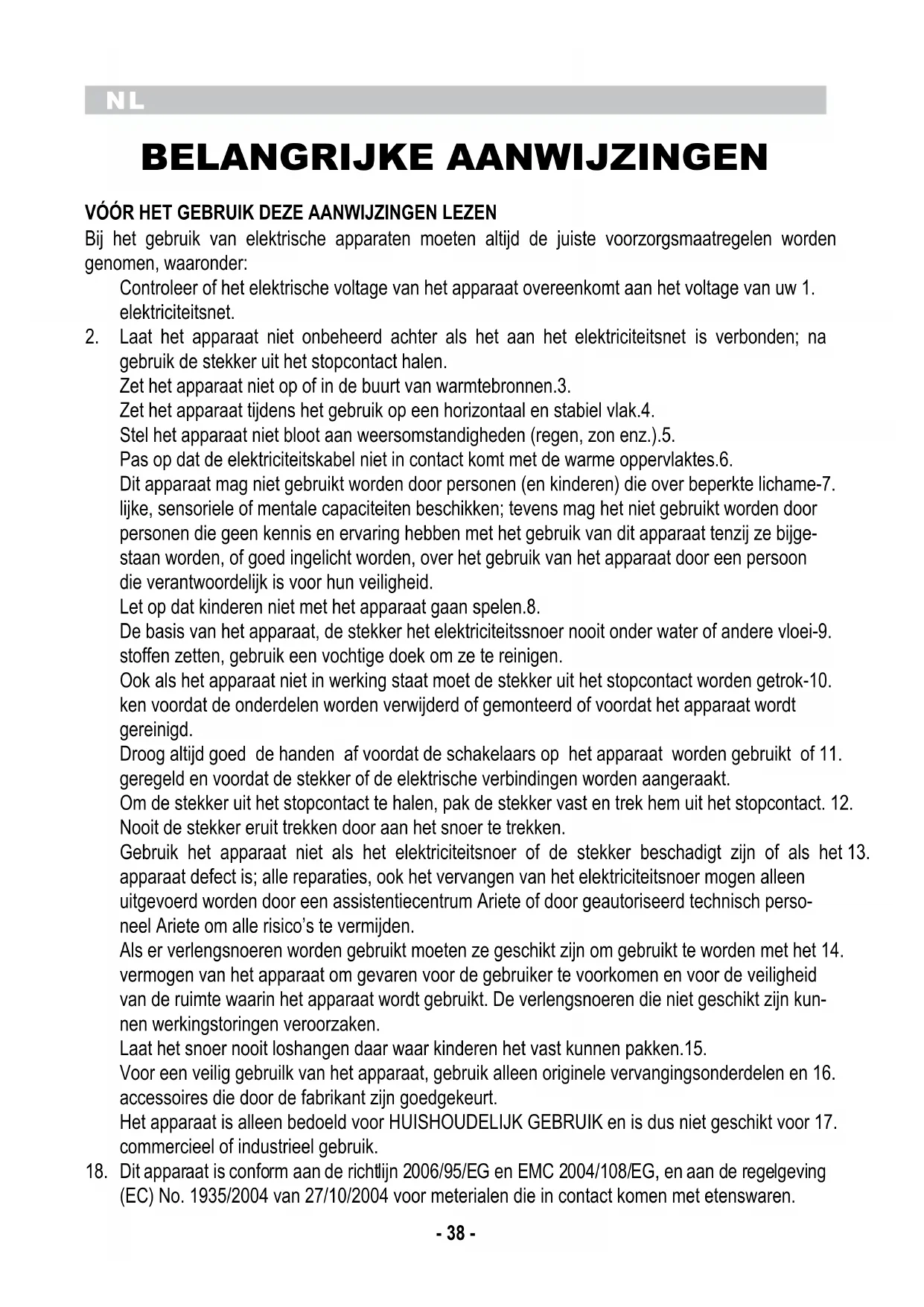 BELANGRIJKE AANWIJZINGEN VÓÓR HET GEBRUIK DEZE AANWIJZINGEN LEZEN Bij het gebruik van elektrische apparaten moeten altijd de juiste voorzorgsmaatregelen worden genomen, waaronder: Controleer of het elektrische voltage van het apparaat overeenkomt aan het voltage van uw 1. elektriciteitsnet. Laat het apparaat niet onbeheerd achter als het aan het elektriciteitsnet is verbonden; na 2. gebruik de stekker uit het stopcontact halen. Zet het apparaat niet op of in de buurt van warmtebronnen.3. Zet het apparaat tijdens het gebruik op een horizontaal en stabiel vlak.4. Stel het apparaat niet bloot aan weersomstandigheden (regen, zon enz.).5. Pas op dat de elektriciteitskabel niet in contact komt met de warme oppervlaktes.6. Dit apparaat mag niet gebruikt worden door personen (en kinderen) die over beperkte lichame-7. lijke, sensoriele of mentale capaciteiten beschikken; tevens mag het niet gebruikt worden door personen die geen kennis en ervaring hebben met het gebruik van dit apparaat tenzij ze bijge- staan worden, of goed ingelicht worden, over het gebruik van het apparaat door een persoon die verantwoordelijk is voor hun veiligheid. Let op dat kinderen niet met het apparaat gaan spelen.8. De basis van het apparaat, de stekker het elektriciteitssnoer nooit onder water of andere vloei-9. stoffen zetten, gebruik een vochtige doek om ze te reinigen. Ook als het apparaat niet in werking staat moet de stekker uit het stopcontact worden getrok-10. ken voordat de onderdelen worden verwijderd of gemonteerd of voordat het apparaat wordt gereinigd. Droog altijd goed de handen af voordat de schakelaars op het apparaat worden gebruikt of 11. geregeld en voordat de stekker of de elektrische verbindingen worden aangeraakt. Om de stekker uit het stopcontact te halen, pak de stekker vast en trek hem uit het stopcontact. 12. Nooit de stekker eruit trekken door aan het snoer te trekken. Gebruik het apparaat niet als het elektriciteitsnoer of de stekker beschadigt zijn of als het 13. apparaat defect is; alle reparaties, ook het vervangen van het elektriciteitsnoer mogen alleen uitgevoerd worden door een assistentiecentrum Ariete of door geautoriseerd technisch perso- neel Ariete om alle risico’s te vermijden. Als er verlengsnoeren worden gebruikt moeten ze geschikt zijn om gebruikt te worden met het 14. vermogen van het apparaat om gevaren voor de gebruiker te voorkomen en voor de veiligheid van de ruimte waarin het apparaat wordt gebruikt. De verlengsnoeren die niet geschikt zijn kun- nen werkingstoringen veroorzaken. Laat het snoer nooit loshangen daar waar kinderen het vast kunnen pakken.15. Voor een veilig gebruilk van het apparaat, gebruik alleen originele vervangingsonderdelen en 16. accessoires die door de fabrikant zijn goedgekeurt. Het apparaat is alleen bedoeld voor HUISHOUDELIJK GEBRUIK en is dus niet geschikt voor 17. commercieel of industrieel gebruik. Dit apparaat is conform aan de richtlijn 2006/95/EG en EMC 2004/108/EG, en aan de regelgeving 18. (EC) No. 1935/2004 van 27/10/2004 voor meterialen die in contact komen met etenswaren.NL
