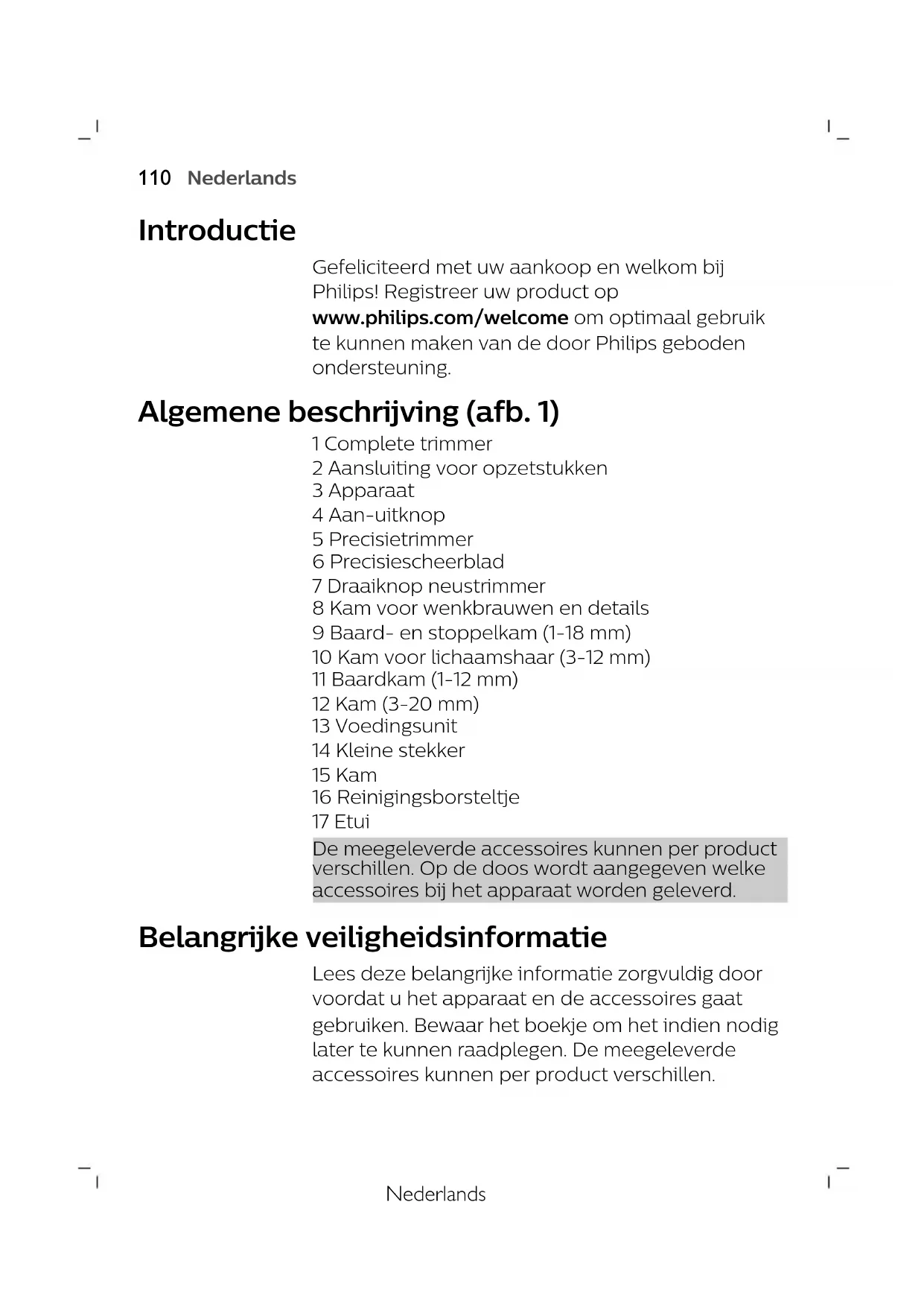 ItalianoNederlands Introductie Gefeliciteerd met uw aankoop en welkom bij Philips! Registreer uw product op www.philips.com/welcome om optimaal gebruik te kunnen maken van de door Philips geboden ondersteuning. Algemene beschrijving (afb. 1) 1 Complete trimmer 2 Aansluiting voor opzetstukken 3 Apparaat 4 Aan-uitknop 5 Precisietrimmer 6 Precisiescheerblad 7 Draaiknop neustrimmer 8 Kam voor wenkbrauwen en details 9 Baard- en stoppelkam (1-18 mm) 10 Kam voor lichaamshaar (3-12 mm) 11 Baardkam (1-12 mm) 12 Kam (3-20 mm) 13 Voedingsunit 14 Kleine stekker 15 Kam 16 Reinigingsborsteltje 17 Etui De meegeleverde accessoires kunnen per product verschillen. Op de doos wordt aangegeven welke accessoires bij het apparaat worden geleverd. Belangrijke veiligheidsinformatie Lees deze belangrijke informatie zorgvuldig door voordat u het apparaat en de accessoires gaat gebruiken. Bewaar het boekje om het indien nodig later te kunnen raadplegen. De meegeleverde accessoires kunnen per product verschillen.