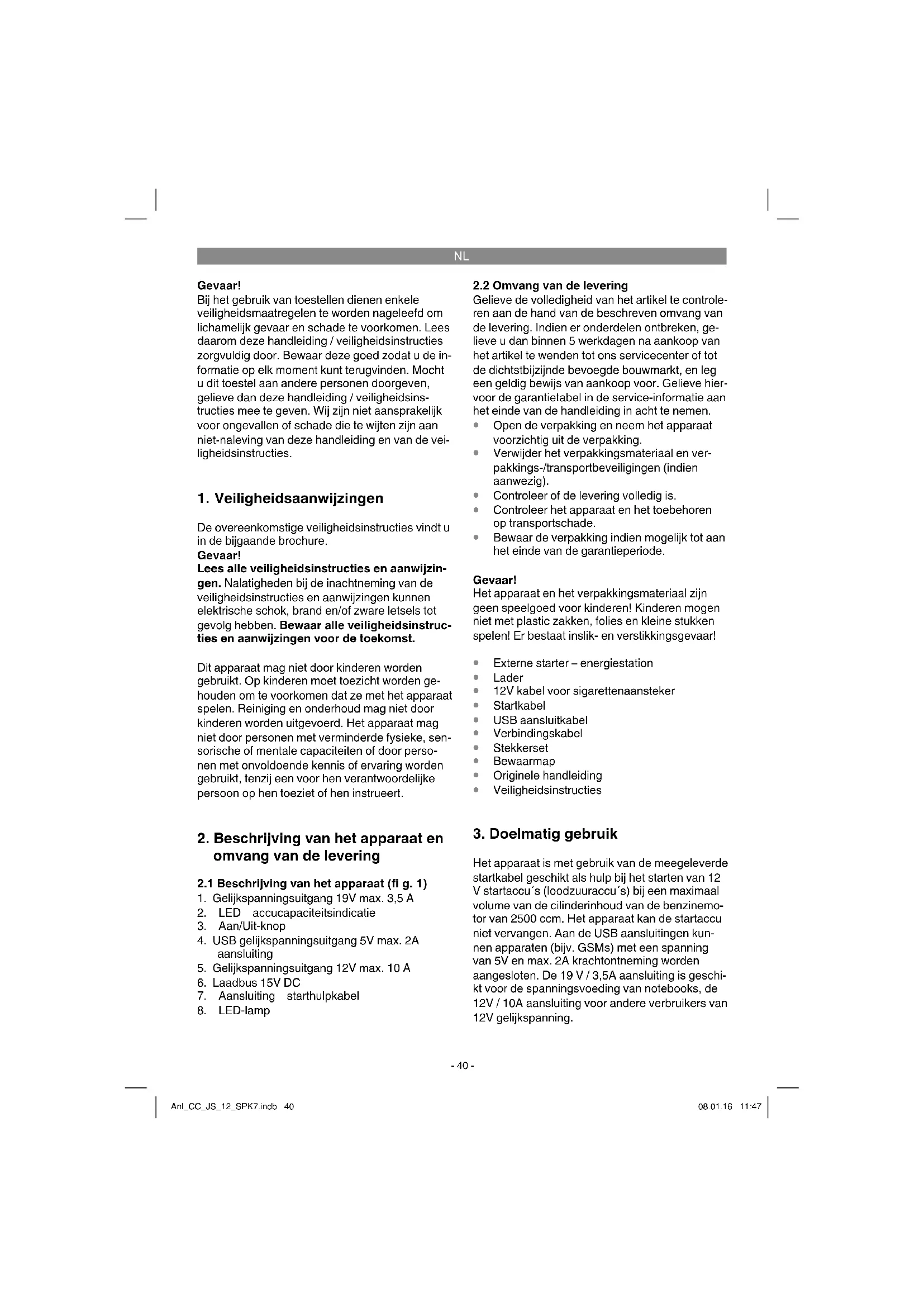 Het apparaat is met gebruik van de meegeleverde startkabel geschikt als hulp bij het starten van 12 V startaccu´s (loodzuuraccu´s) bij een maximaal volume van de cilinderinhoud van de benzinemo- tor van 2500 ccm. Het apparaat kan de startaccu niet vervangen. Aan de USB aansluitingen kun- nen apparaten (bijv. GSMs) met een spanning van 5V en max. 2A krachtontneming worden aangesloten. De 19 V / 3,5A aansluiting is geschi- kt voor de spanningsvoeding van notebooks, de 12V / 10A aansluiting voor andere verbruikers van 12V gelijkspanning. Anl_CC_JS_12_SPK7.indb 40Anl_CC_JS_12_SPK7.indb 40 08.01.16 11:4708.01.16 11:47NL