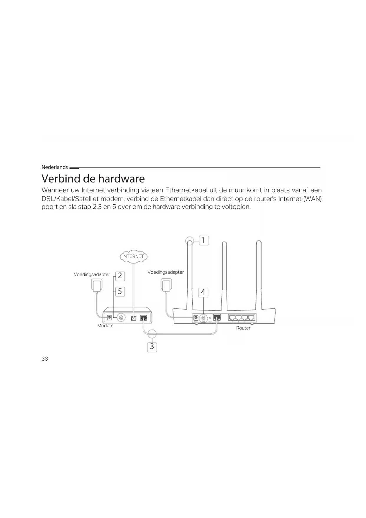 Verbind de modem met de Internet (of WAN) poort van de router met een Ethernetkabel.