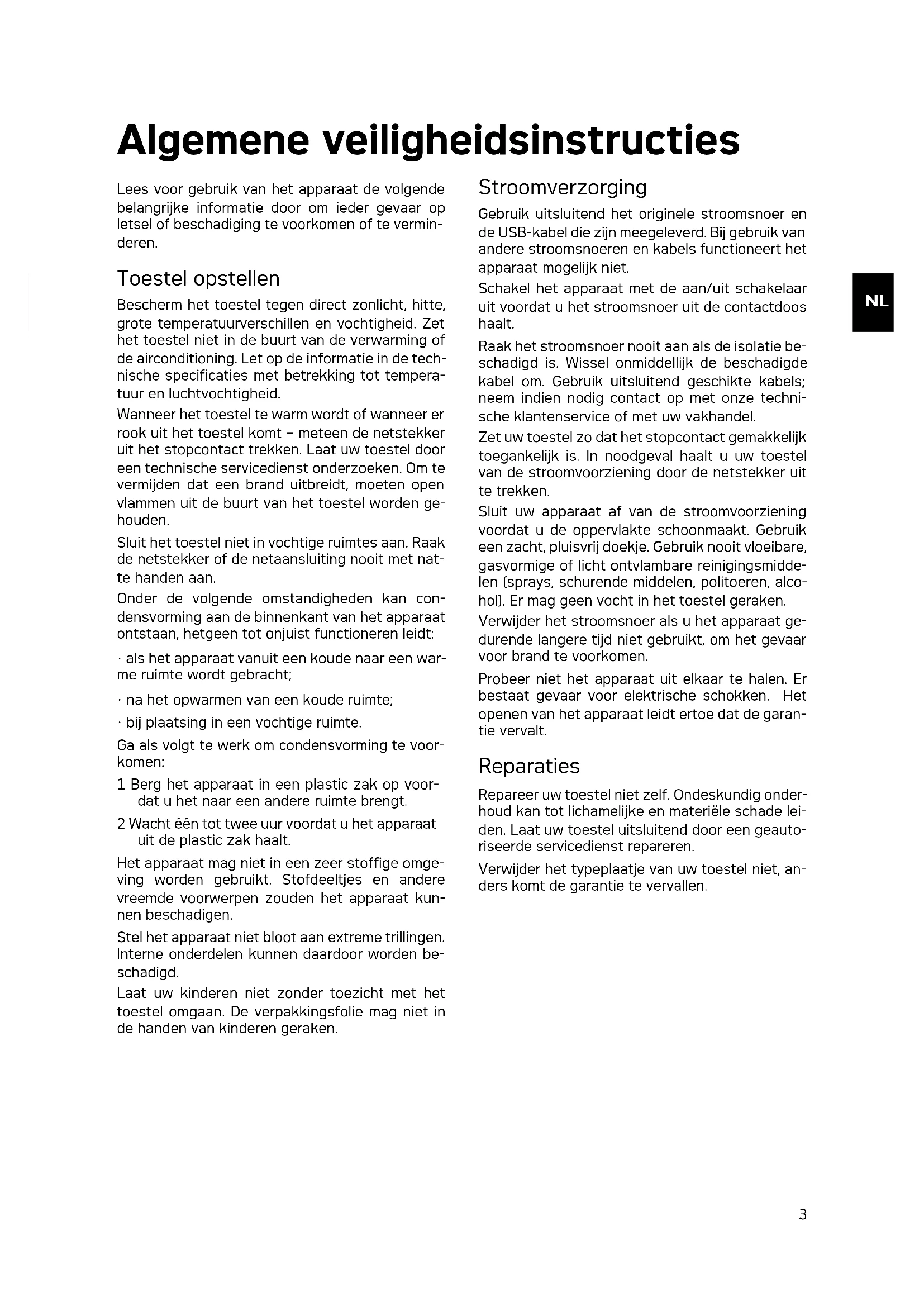 Zet uw toestel zo dat het stopcontact gemakkelijk toegankelijk is. In noodgeval haalt u uw toestel van de stroomvoorziening door de netstekker uit te trekken.