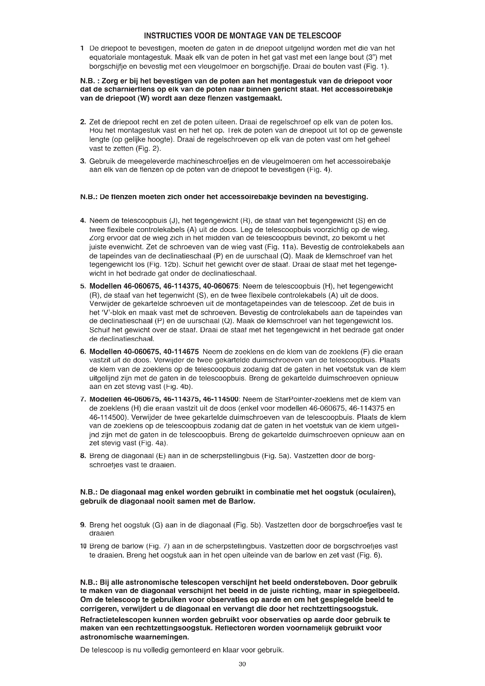 Modellen 46-060675, 46-114375, 40-060675: Neem de telescoopbuis (H), het tegengewicht (R), de staaf van het tegenwicht (S), en de twee flexibele controlekabels (A) uit de doos. Verwijder de gekartelde schroeven uit de montagetapeindes van de telescoop. Zet de buis in het ʻVʼ-blok en maak vast met de schroeven. Bevestig de controlekabels aan de tapeindes van de declinatieschaal (P) en de uurschaal (Q). Maak de klemschroef van het tegengewicht los. Schuif het gewicht over de staaf. Draai de staaf met het tegengewicht in het bedrade gat onder de declinatieschaal.