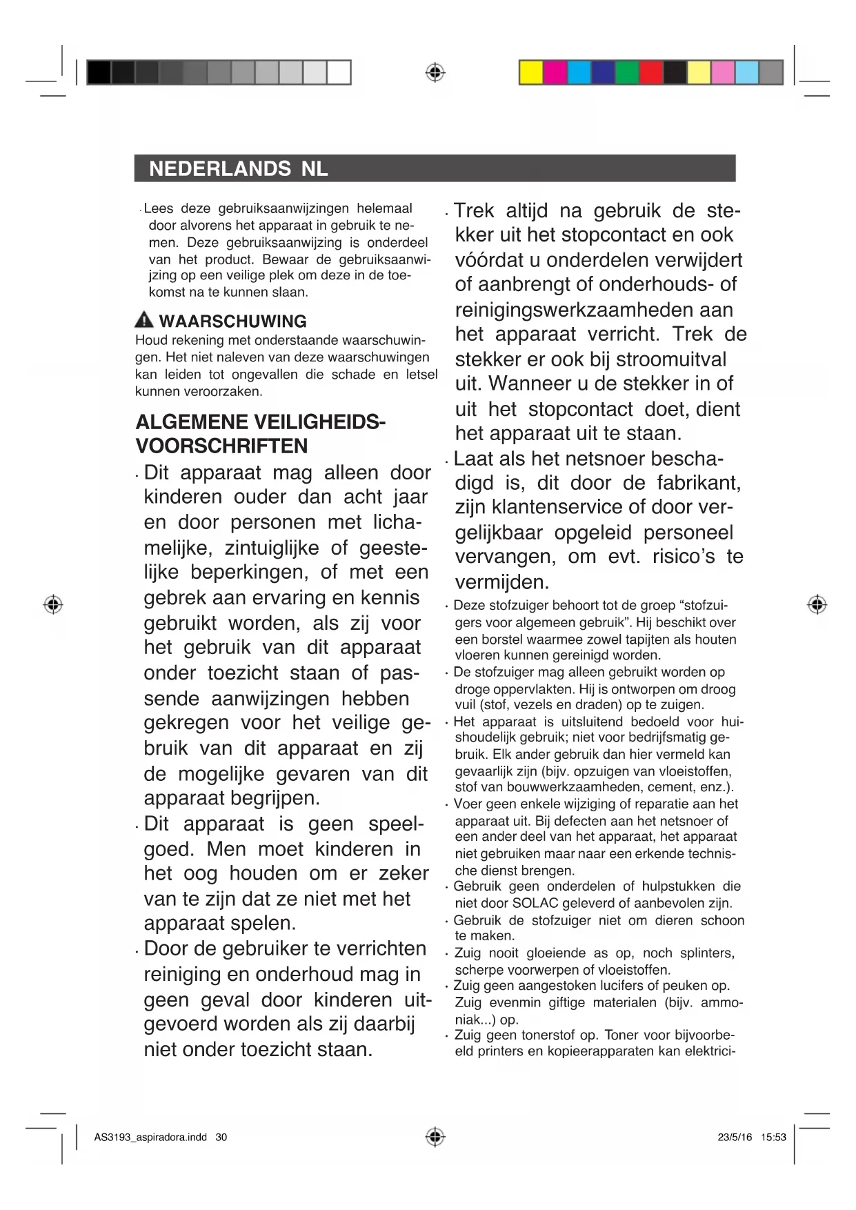 - Zuig geen tonerstof op. Toner voor bijvoorbe- eld printers en kopieerapparaten kan elektrici- AS3193_aspiradora.indd 30 23/5/16 15:53nl teit geleiden.