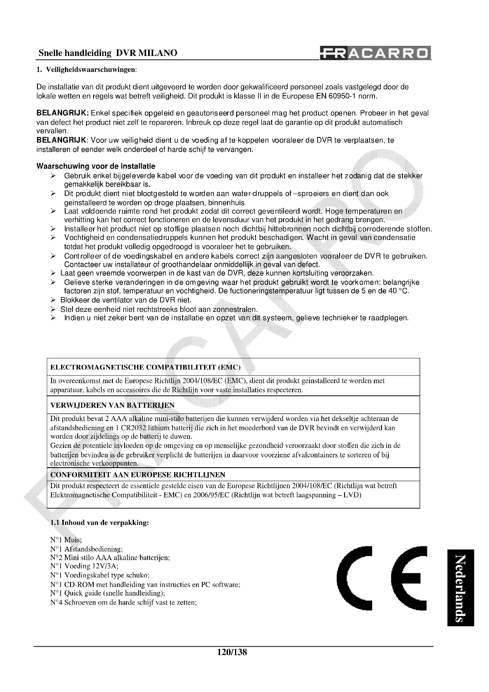 De installatie van dit produkt dient uitgevoerd te worden door gekwalificeerd personeel zoals vastgelegd door de lokale wetten en regels wat betreft veiligheid. Dit produkt is klasse II in de Europese EN 60950-1 norm. BELANGRIJK: Enkel specifiek opgeleid en geautoriseerd personeel mag het product openen. Probeer in het geval van defect het product niet zelf te repareren. Inbreuk op deze regel laat de garantie op dit produkt automatisch vervallen. BELANGRIJK: Voor uw veiligheid dient u de voeding af te koppelen vooraleer de DVR te verplaatsen, te installeren of eender welk onderdeel of harde schijf te vervangen. Waarschuwing voor de installatie Gebruik enkel bijgeleverde kabel voor de voeding van dit produkt en installeer het zodanig dat de stekker gemakkelijk bereikbaar is. Dit produkt dient niet blootgesteld te worden aan water-druppels of –sproeiers en dient dan ook geinstalleerd te worden op droge plaatsen, binnenhuis. Laat voldoende ruimte rond het produkt zodat dit correct geventileerd wordt. Hoge temperaturen en verhitting kan het correct fonctioneren en de levensduur van het produkt in het gedrang brengen. Installeer het product niet op stoffige plaatsen noch dichtbij hittebronnen noch dichtbij corroderende stoffen. Vochtigheid en condensatiedruppels kunnen het produkt beschadigen. Wacht in geval van condensatie totdat het produkt volledig opgedroogd is vooraleer het te gebruiken. Controlleer of de voedingskabel en andere kabels correct zijn aangesloten vooraleer de DVR te gebruiken. Contacteer uw installateur of groothandelaar onmiddellijk in geval van defect. Laat geen vreemde voorwerpen in de kast van de DVR, deze kunnen kortsluiting veroorzaken. Gelieve sterke veranderingen in de omgeving waar het produkt gebruikt wordt te voorkomen: belangrijke factoren zijn stof, temperatuur en vochtigheid. De fuctioneringstemperatuur ligt tussen de 5 en de 40 °C. Blokkeer de ventilator van de DVR niet. Stel deze eenheid niet rechtstreeks bloot aan zonnestralen. Indien u niet zeker bent van de installatie en opzet van dit systeem, gelieve technieker te raadplegen.