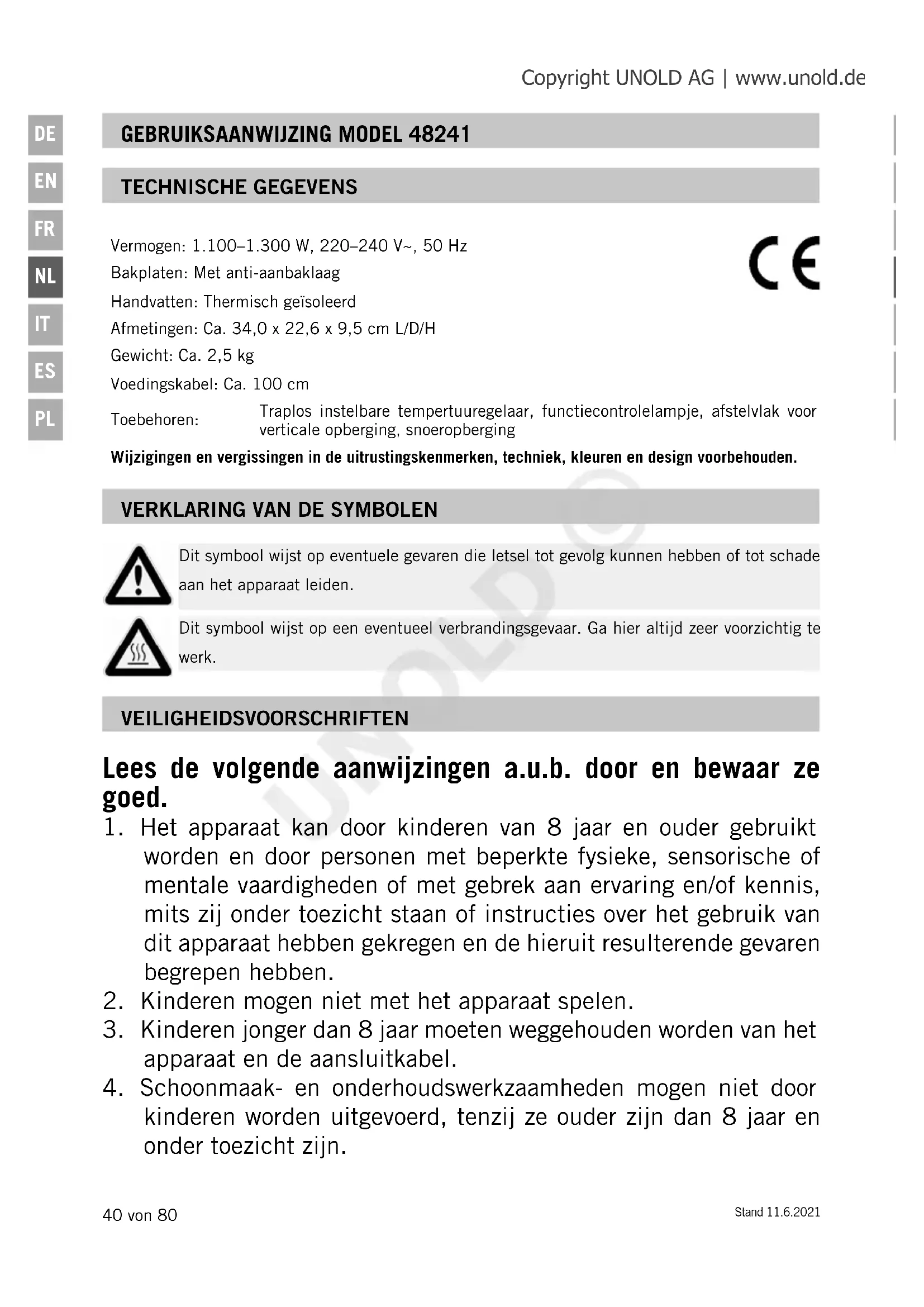 Vermogen: 1.100–1.300 W, 220–240 V~, 50 HzBakplaten: Met anti-aanbaklaagHandvatten: Thermisch geïsoleerdAfmetingen: Ca. 34,0 x 22,6 x 9,5 cm L/D/HGewicht: Ca. 2,5 kgVoedingskabel: Ca. 100 cmToebehoren:Traplos instelbare tempertuuregelaar, functiecontrolelampje, afstelvlak voor verticale opberging, snoeropbergingWijzigingen en vergissingen in de uitrustingskenmerken, techniek, kleuren en design voorbehouden. GEBRUIKSAANWIJZING MODEL 48241 VEILIGHEIDSVOORSCHRIFTEN TECHNISCHE GEGEVENS Lees de volgende aanwijzingen a.u.b. door en bewaar ze goed.