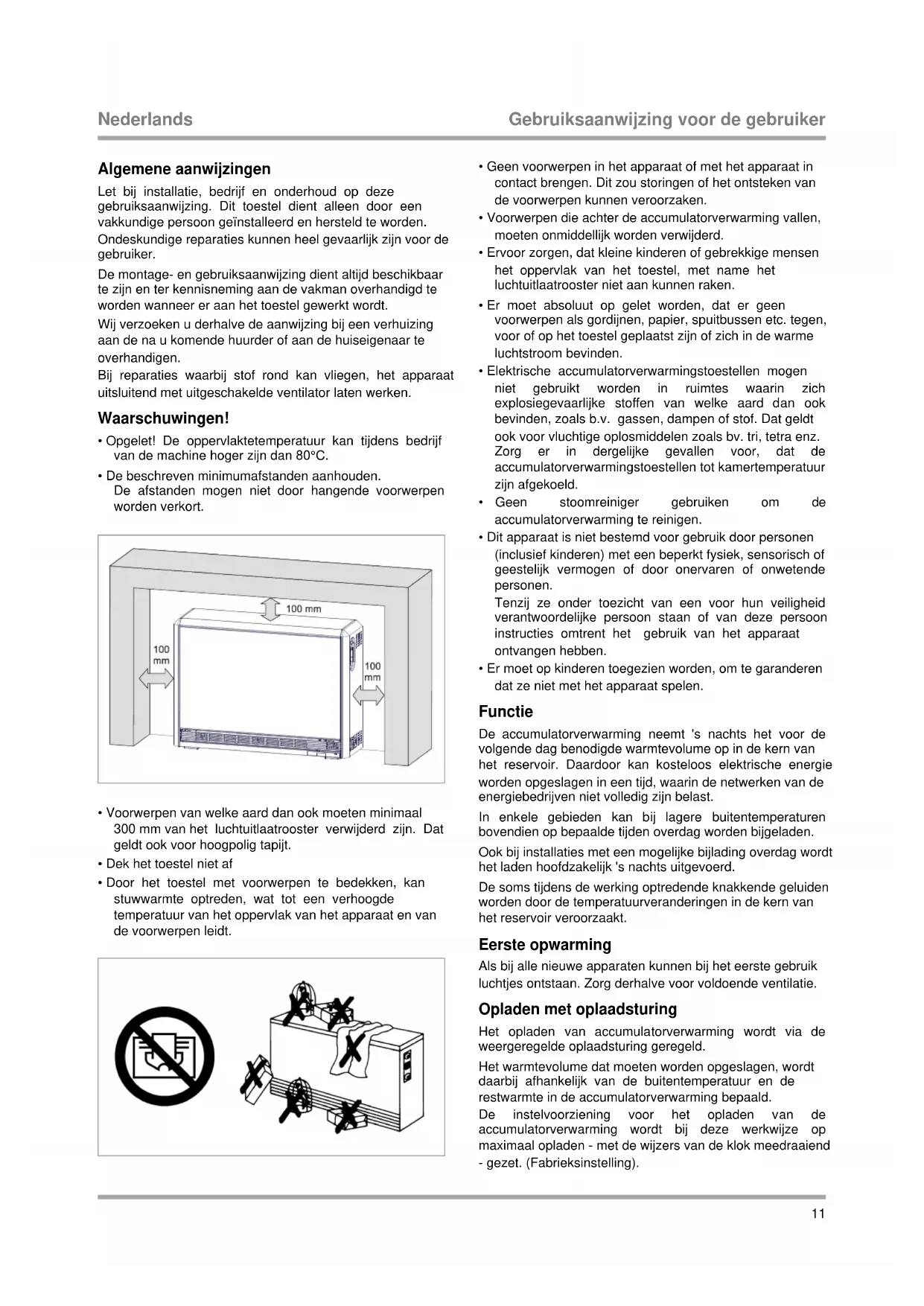- Elektrische accumulatorverwarmingstoestellen mogen niet gebruikt worden in ruimtes waarin zich explosiegevaarlijke stoffen van welke aard dan ook bevinden, zoals b.v. gassen, dampen of stof. Dat geldt ook voor vluchtige oplosmiddelen zoals bv. tri, tetra enz. Zorg er in dergelijke gevallen voor, dat de accumulatorverwarmingstoestellen tot kamertemperatuur zijn afgekoeld.