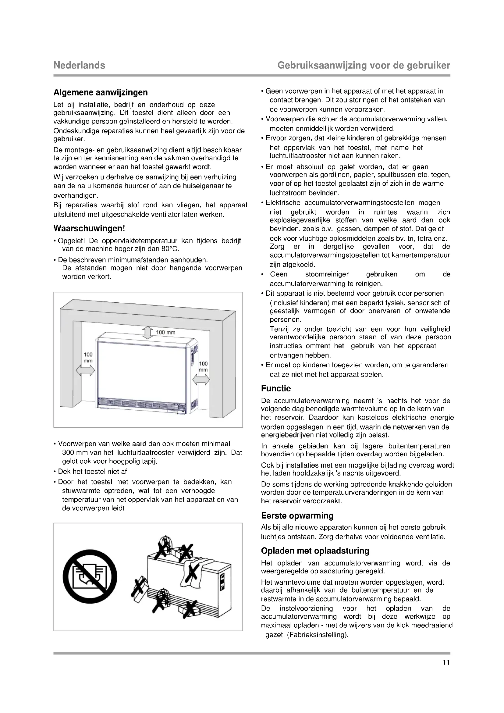 - Voorwerpen die achter de accumulatorverwarming vallen, moeten onmiddellijk worden verwijderd.